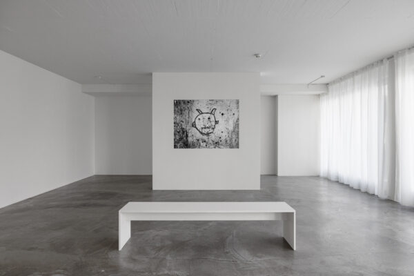 In another way, the work Rainbow (2016/2018) undertakes a material intervention in the concrete architecture of the gallery. Following the artist’s instructions, the three bearing columns of the space were painted in nine different colors in a certain order, one color after another. The last layer was set as a white RAL, so that the changes are only recognizable in the traces of paint on the edges and corners.