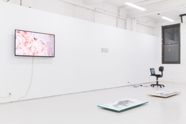 “Void 0 combines a love for clipping through stage geometry with an infinite bath. It is the culmination of work by two artists, Clare Gatto and Kara Gut, who use the machinations of a simulated world to create images of slippery definition. The show plays with various versions of input and output to reveal biology through synthetics and mythology through game design.” – Kara Güt and Clare Gatto