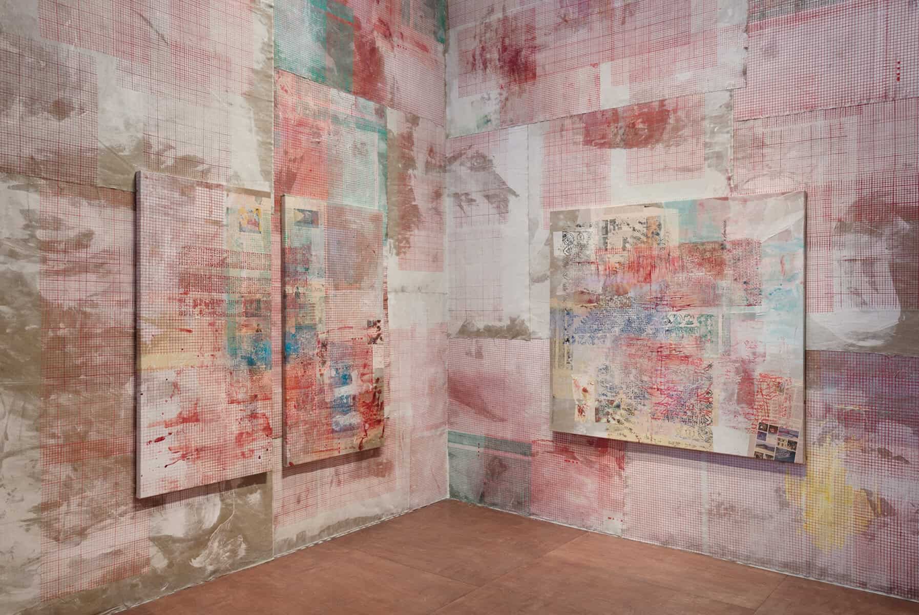 “…For this exhibition, El-Sayegh has created a skin of unstretched canvases that wraps the walls of the gallery, overlaid with a new suite of Net-Grid paintings. A continuation of the artist’s ongoing Net-Grid series (begun in 2013), this installation offers insight into the method of their making. Created through the assemblage of material and overlaid with hand-painted grids, these works represent the process of trapping, distilling, and retaining information, capturing both intended meaning and happenstance associations. Beneath each clean, schematic exterior lies a bruised surface that evokes wounded flesh. This dense material layering is echoed in the accompanying sound work, which reverberates throughout the space, breathing and vibrating in a low hum. Here, El-Sayegh’s dense red grids, intense layers of color, and aural environment work in tandem to create a visceral experience that is both bodily and cerebral.