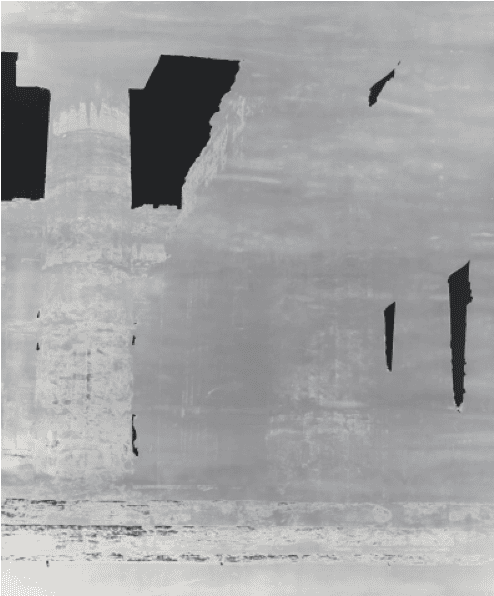 Drawing on the Buddhist idea of the nine stages of decomposition, El-Sayegh infuses each painting with interstices and flesh-like pigment that represent an ambiguous process, the direction of which (towards healing or towards decay) is deliberately obscured. Here, El- Sayegh’s grid becomes a protective sheath, a girdle holding the damaged tissue of the body together. In one painting, transliterated cut script, El-Sayegh draws on traditional Buddhist woodblock prints, which were often printed on rice paper and worn on the body as a talisman for protection. This work is composed of layers of blue, red, and green pigment, combined with silk- screened images of a Buddhist print, the artist’s father’s calligraphy, Financial Times articles, muslin, and surgical gauze. A self-harm injury, referred to as dermatitis artefacta―a deliberate self-infliction of lesions—is carefully rendered, and is the only hand-painted element in transliterated cut script apart from the grid itself. The piece draws on a specific woodblock print that appears throughout, featuring the eight-armed Bodhisattva Mahapratisara in the center surrounded by the dharani (Buddhist mantra), 33 ritual objects of esoteric Buddhism, mudras, and Bodhisattvas on lotus pedestals…” – Lehmann Maupin