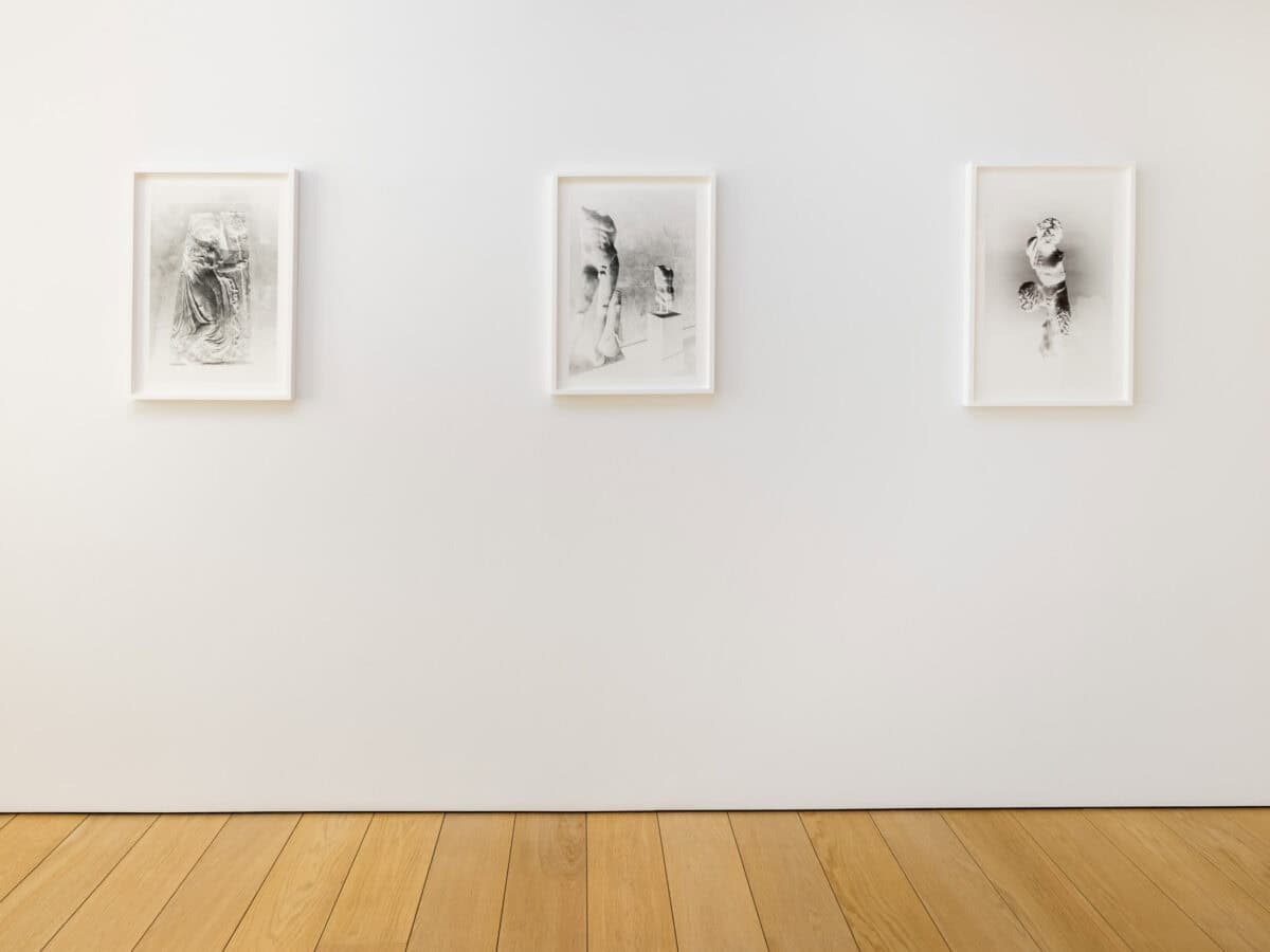 “…The second gallery is painted in deep ultramarine blue, emulating the ‘Blue Room’ in the artist’s studio. A meditative space is built within the gallery featuring Syzygy, Viktor’s first figurative canvas reflecting the aesthetic vernacular the artist has developed over the past four years. Also on view are three works from A Haven. A Hell. A Dream Deferred. These works reinterpret the Libyan Sybil, a prophetess from antiquity invoked by eighteenth-century abolitionists as a mythical oracle who foresaw the trans-Atlantic slave trade.