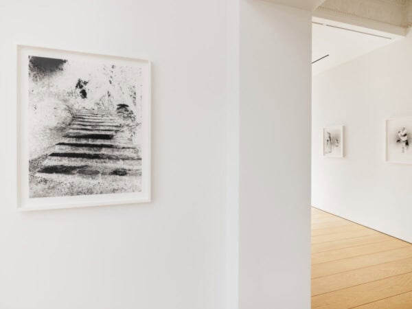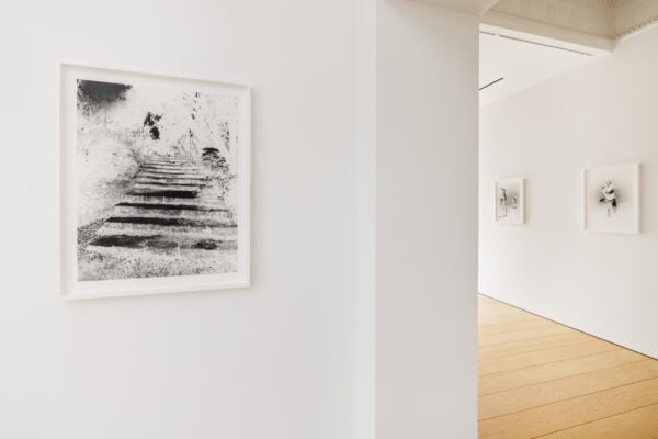 “Jeffrey Meris’s hanging sculptures, reminiscent of chandeliers, are made of aluminium piping, ceramic vessels, and spider plants. These materials, along with Meris’s shift from working with steel and iron to aluminum, a lighter, and, as Meris says, a more “intimate” metal—often found in domestic spaces for plumbing—can be seen as a metaphor for the shift in the artist’s practice, once centered around conversations of racialized trauma, to one focused on a steadfast devotion to healing, cleansing, and rituals of care.” – James Cohan Gallery