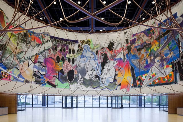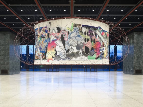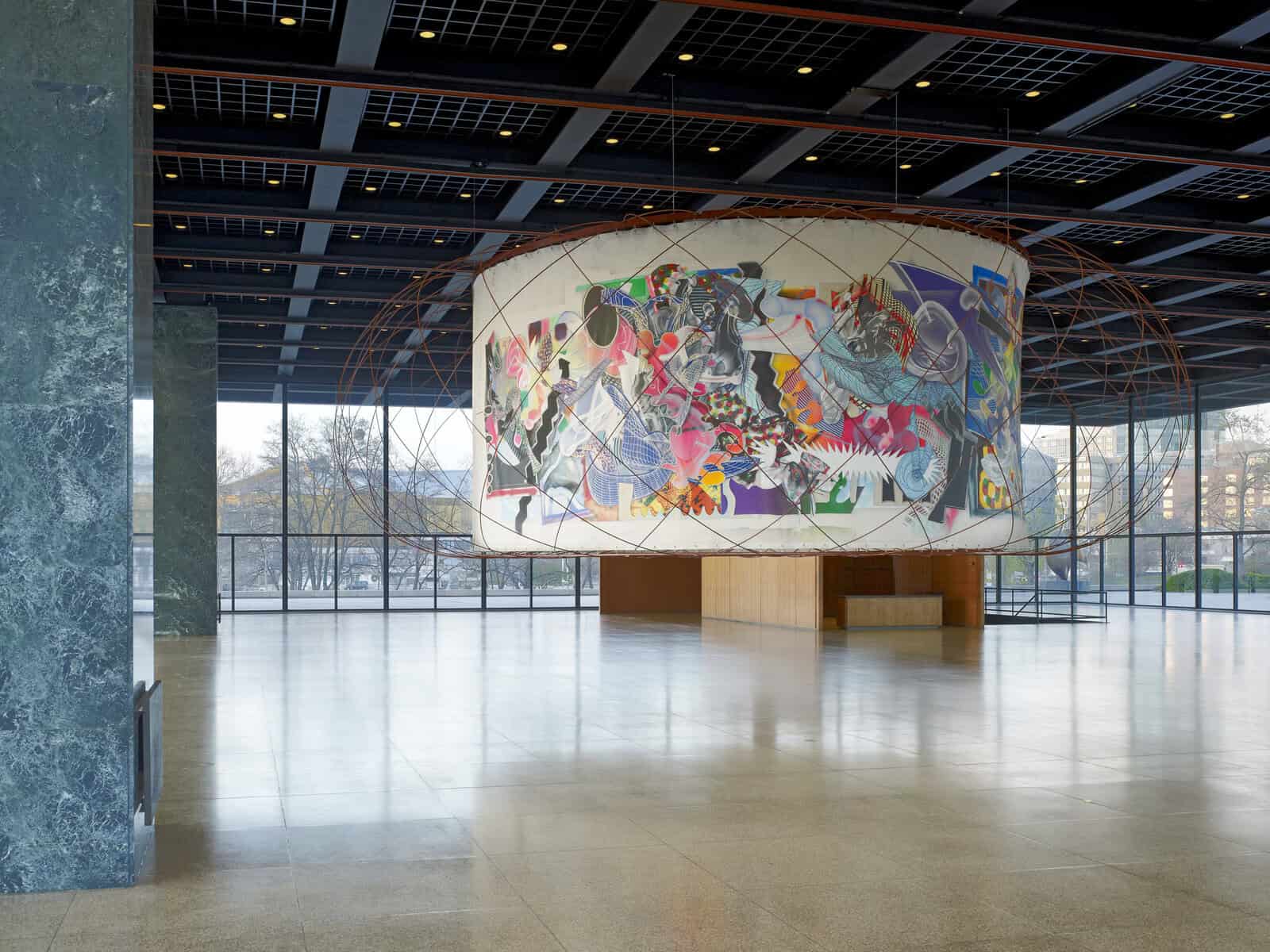 “Upon approaching the renown last building by Mies van der Rohe, a distinct glass pavilion supported by the German architect’s signature grid of steel beams, one immediately is captivated by the massive caged painting that hangs roughly seven feet from the floor. The structure, a collaboration between Santiago Calatrava and Frank Stella, is at once imposing and sublime. The neon colors of the 98 foot mural immediately jump out and clash against the surrounding stoic tones, while the gridded donut enclosure acts as an update the stagnant flat grid of Late Modern architecture. The collaboration between these two acclaimed figures manifests as an attempt to create a visual narrative within the space that traces a route from the Modern to the Contemporary. The Curtain certainly takes cues from early 20th century murals, but instead of opting for a figurative approach, this collaboration tells an abundantly abstract story of the reciprocating influence that painting and architecture have had upon one another, as well as point toward a vivid future where both disciplines can merge into one grand gesture.