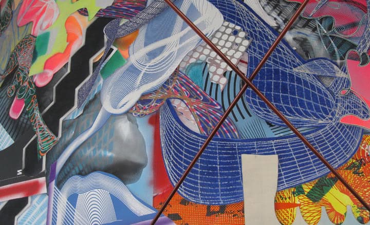 Although Stella’s work appears flat from a distance, closer examination of the structure reveals a vibrating surface that contains multiple layers and shapes that could be mistaken for onomatopoeia bubbles found in comic books or default software paint brushes – a gesture that speaks as much to PaintFX as it does to the legacy of Roy Liechtenstein. Amidst all of the organic forms, and their inorganic color schemes, glimpses of a comment on the bravado of architecture peak out intermittently. Warped gridded lines move along the mural in strokes that begin to resemble columns. The shapes that undulate beneath the top surface reference mechanical floor plan drawings, or else borrow from a palette familiar to anyone who has worked with a CAD process. But as quickly as these nods appear to the viewer, they recede just as rapidly behind gradients pulled from the look of an 80s air-brushed billboard.