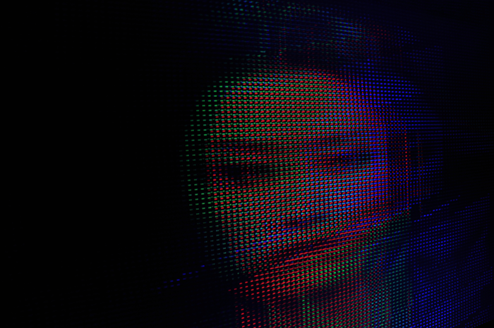 “An ordinary situation in a technoid world: strolling through the streets and passing enormous LED screens consisting of tiny points of light that generate an impression of reality. This reality is such a familiar and an integral part of our daily life that the viewer hardly reflects on it. What would happen if the image were to change as the viewer approached it? If the digital face suddenly became distorted? If the confines of this supposed reality were suddenly dissolved? These questions intrigued us while working on »fragments of RGB«. This project experiments with illusion and perception on various levels. The classic LED screen as a medium was simulated and disintegrated by the creation of a pixel-like optic using simple projection rather than the entire image’s being comprised of individual points of light. If one examines the idea of perception more closely, especially individual perception – which differs from individual to individual – then a second consideration arises in regard to »fragments of RGB«.” – Onformative