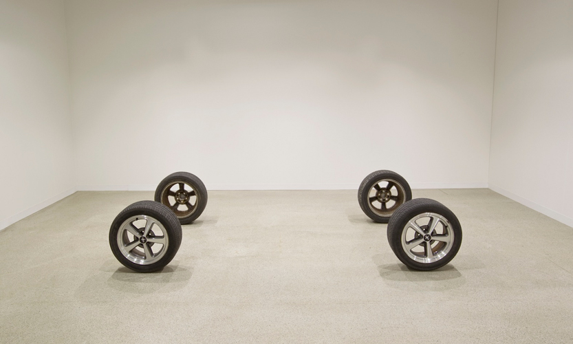 One room of the gallery houses The Weather (all works 2013), three sets of automobile tires—two Ford, one BMW—arrayed in rows, as if the vehicles they supported had suddenly vanished into some sort of ether. Or are they somehow hidden in plain sight? It’s unsettling to walk through each rectangular set—you half expect to smack into a chassis. Manufacturers’ markings remain on the tires—bits of text and colored stripes that recall Fred Sandback’s string sculptures, which similarly use minimal means to create the illusion of immensity.