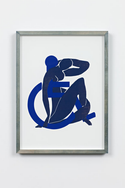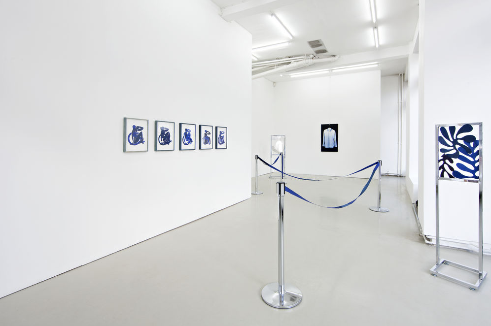 The walls of the next room are covered in the kind of white mesh netting found on construction sites, and a set of stanchions in the center of the gallery are connected with white bands made of silk and soy. This sense that the show is still in development is underscored by the fact that numerous works are titled TBD—to be determined. In one film projected on that netting, silhouettes of birds flutter on branches; another film takes the form of a slide show of simple but handsome collages—images of textures and various people (many fashion types) cut and pasted together or laid one on top of another (think Schwitters or Villeglé at their sparest) and then scanned into a computer. It’s accompanied by the sound of birds chirping.