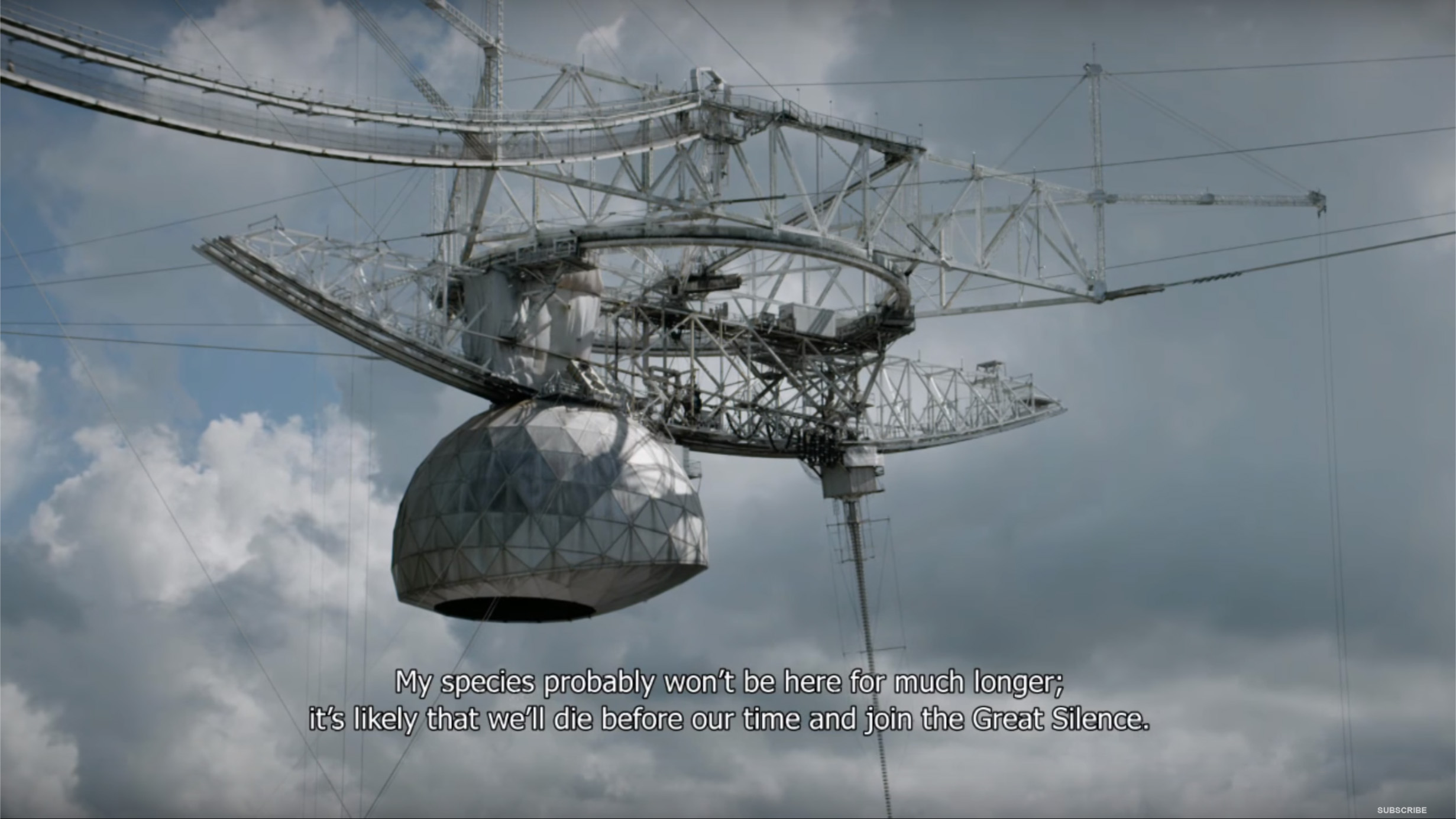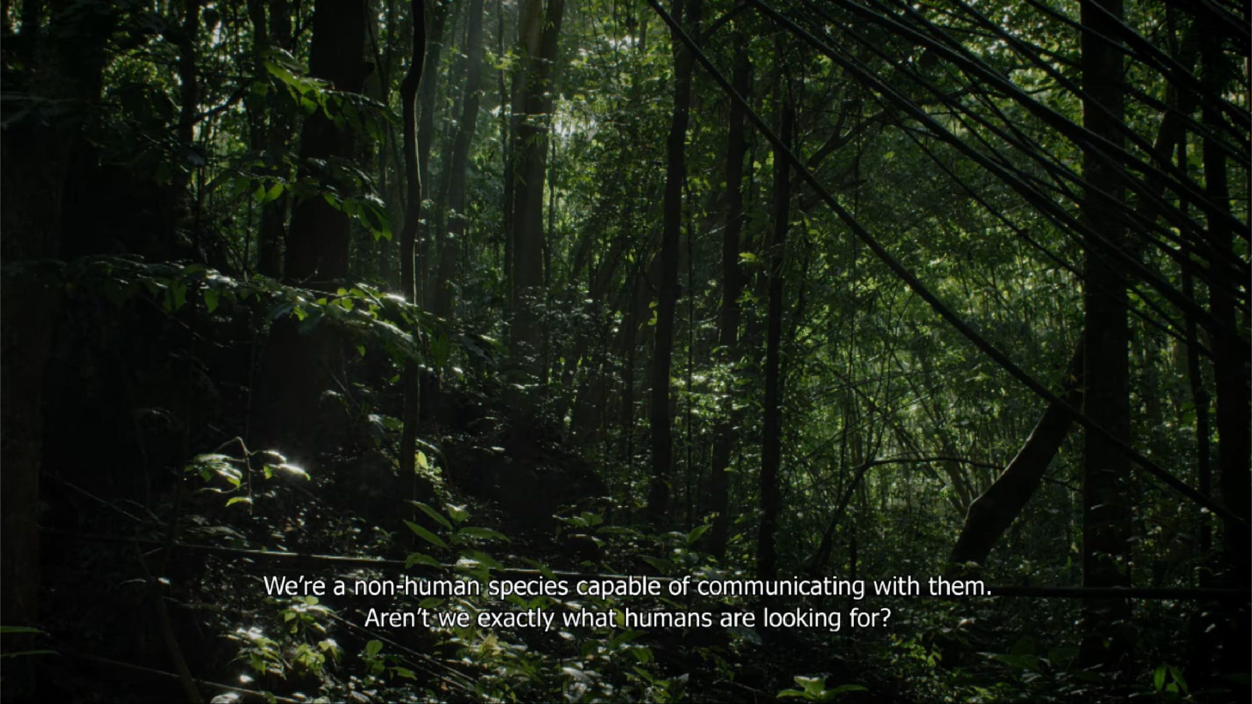 “The Great Silence focuses on the world’s largest single aperture radio telescope, located in Esperanza (Hope), Puerto Rico, which transmits and captures radio waves to and from the farthest edges of the universe. The site of the Arecibo Observatory is also home to the last remaining wild population of critically endangered Puerto Rican Parrots, Amazona vittata. Allora & Calzadilla collaborated with science fiction author Ted Chiang on a subtitled script about the bird’s observations on humans’ search for life outside this planet, while using the concept of vocal learning—something that both parrots and humans, and few other species have in common—as a source of reflection upon acousmatic voices, ventriloquisms, and the vibrations that form the basis of speech and the universe itself.” – Impakt.nl