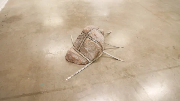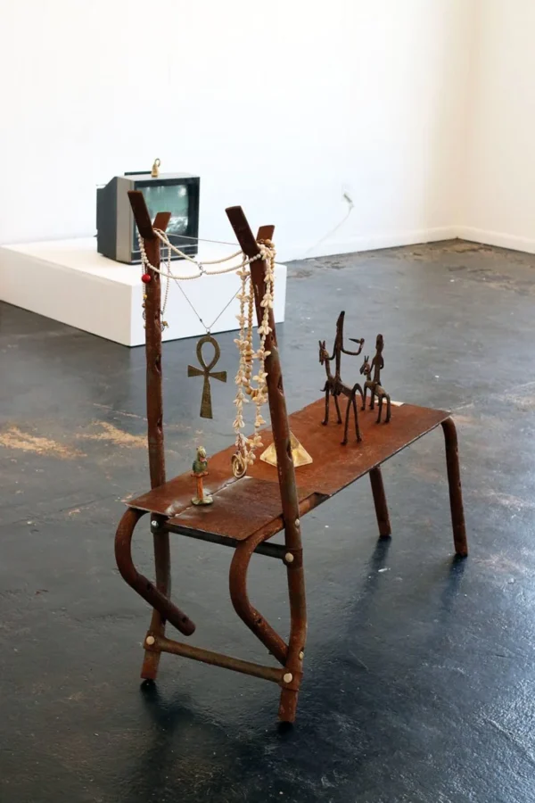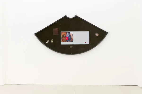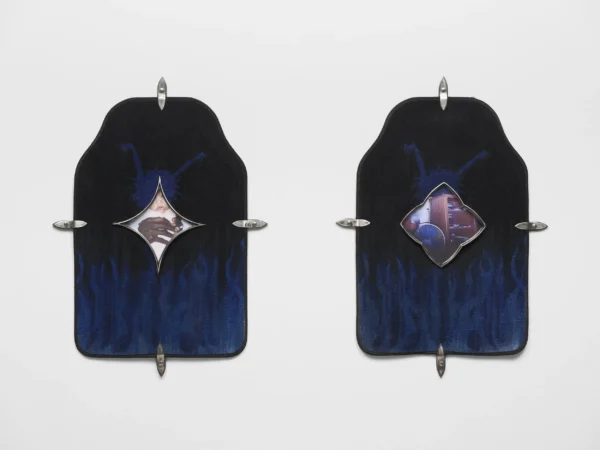 “Y. Malik Jalal (b. 1994, Savannah, Georgia) utilizes traditional craft and collage techniques to explore themes of Black history, power and humanity. By merging materials like steel and iron with an index of found photos depicting Black American family life in unexpected and intimate moments, he addresses the transformation of industries and inequalities, referencing both the legacy of metal artisans in the South and pop culture. His work combines African customs with violent American events, incorporating symbols from advertising and Black horror to reflect collective anxiety. Influenced by Islam, Christianity, and Spiritualism, Jalal’s art forms a multifaceted expression of Blackness, drawing from diverse perspectives and critiquing societal norms.” – murmurs