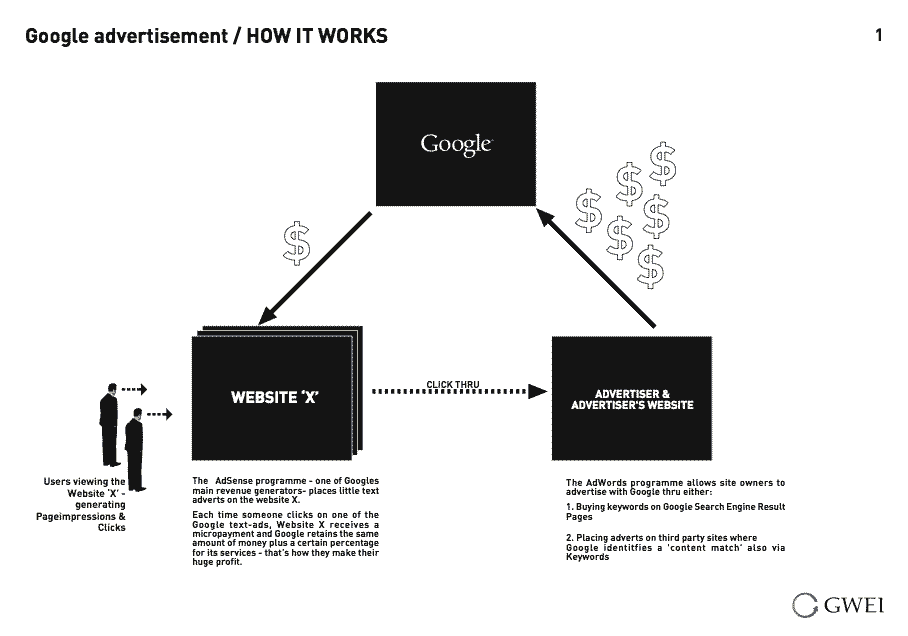 “One of Google’s main revenue generators is the “Adsense”* program: It places hundreds of thousands of little Google text-ads on websites around the world.