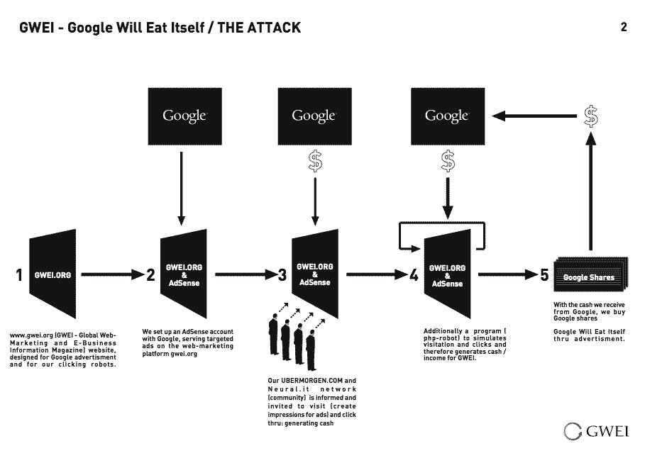 Important: Google Will Eat Itself works by using a social phenomenon rather than depending on a purely technical method (for example a simple click-farm). Because of this social dimension empowered by technology, Google is not able to fight GWEI and it`s franchises by using their regular counter-fraud methods.