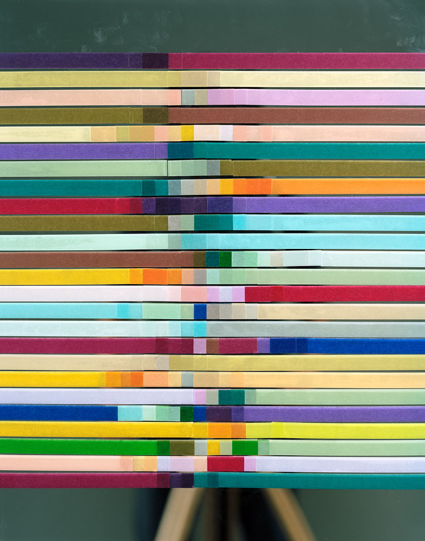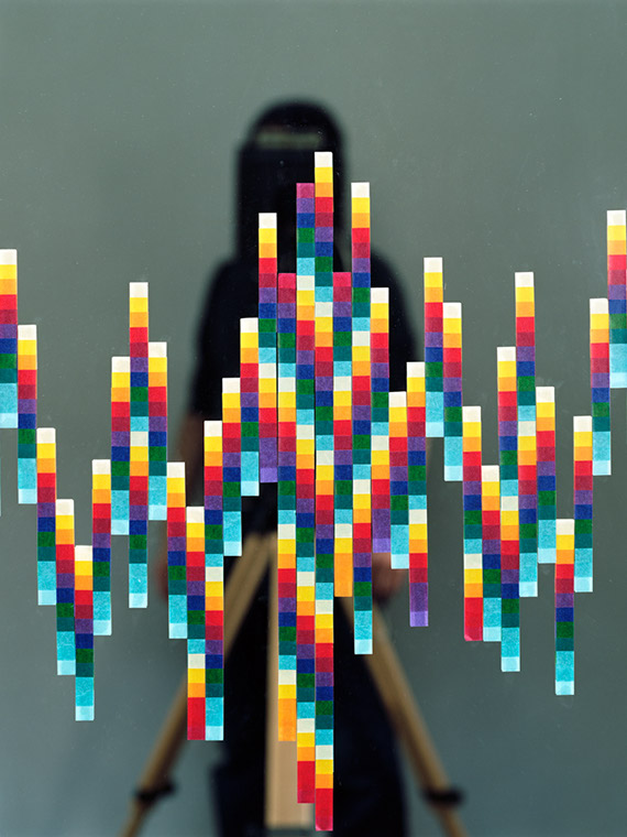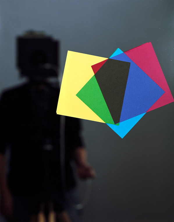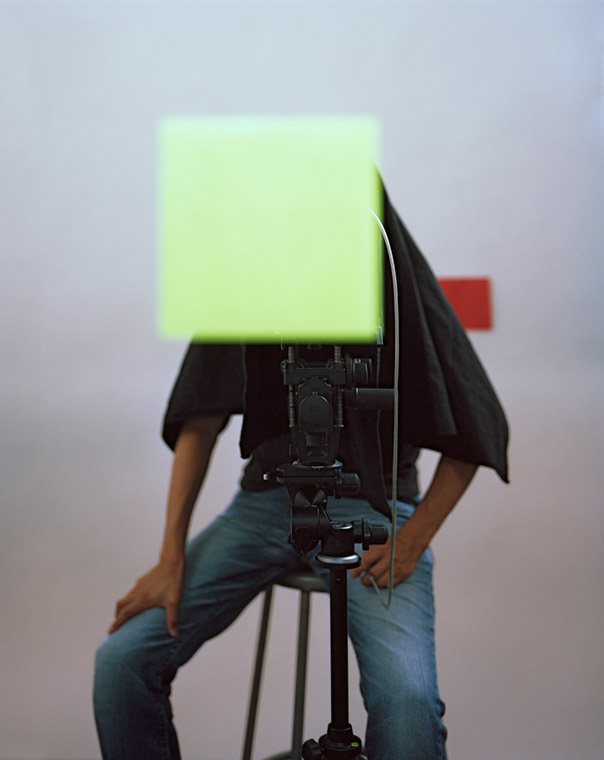 Further, as with many of my other works the photographs also expresses my interest in the role of digital technology in photography and its aesthetic. The choice of red, green, and blue tape is based on the three primary colors that constitute a pixel. From a far the tapes can be seen as the pixels glowing on the computer screen. While they are made using primarily traditional photographic methods, they reference the new aesthetic that seems to be emerging as a result of the use of digital tools and technologies. The photographs always depict a silhouette of the hidden artist affirming the complex nature of authorship in the digital world.” – Akihiko Miyoshi