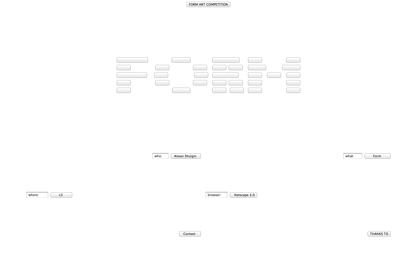 “In 1997, he released his first interactive work, Form Art, in which only minimum factors are programmed in the form of HTML. Shulgin describes this page as a “formalistic” aesthetical art site”. Navigating this site requires aimless click-throughs of blank boxes and links, which lead the viewer through countless pages of “form art” animations made up of Shulgin’s boxes. Some of the more interesting discoveries on the page include a “Gomputer Game”, which allows the viewer to make arbitrary decisions upon which link to cick- sometimes leading to the next round, other times often merely ending up at the “you lose” page. From the homepage of Shulgin’s Form site however, one can navigate to a list of the artist’s resume and their respective links. The webpage could very well be several years old if the latest postings accurately read “1997”, making this an interesting look into the early internet tools via HTML. This was aimed at the influence of a networking process on the Internet.” – via Wikipedia