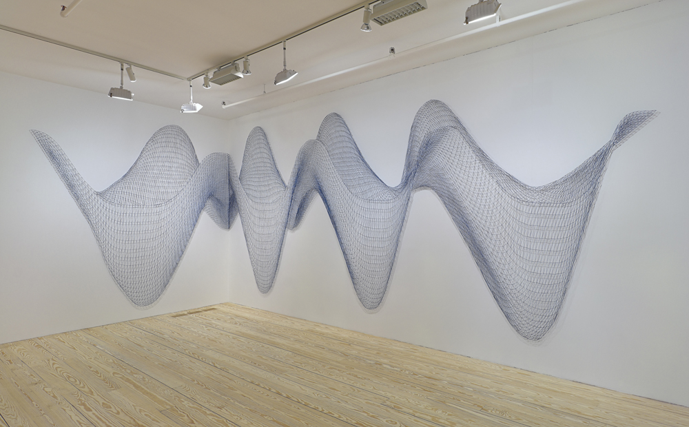 Ms. Shotz evokes natural phenomena with accumulations of beads, pins and other common materials. She isn’t alone in this — Tara Donovan comes to mind — but her creations have a geekier, less arbitrary aspect. Often they respond to the challenge of visualizing concepts from theoretical physics (string theory, dark matter)…” – Karen Rosenberg for the New York Times