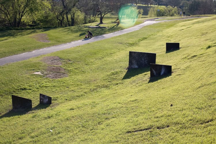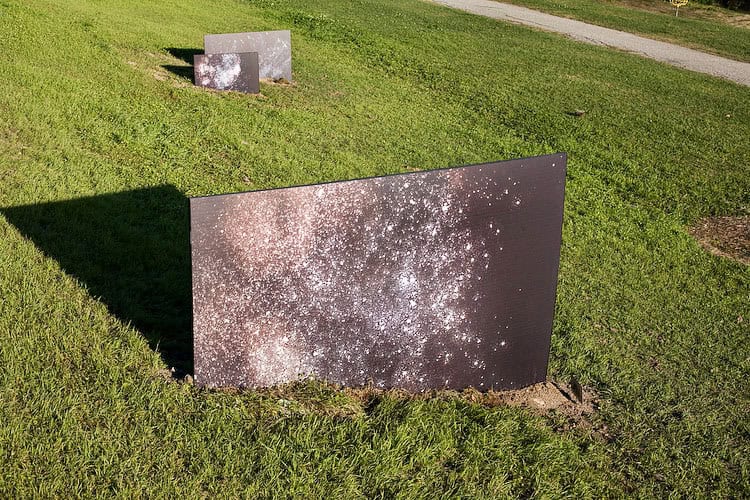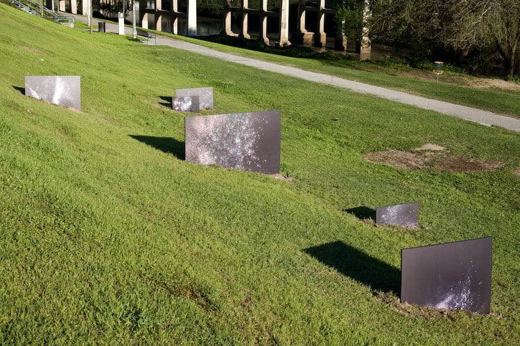 “The title of the work comes from a quote from the Swiss born artist, Kurt Seligmann , describing alchemy and its relation to the mid-century avant-guard where, for him, alchemy served as a symbol for spiritual harmony. The installation consists of six panels submerged like monoliths into the grassy slope of Buffalo Bayou that range in size from four by six feet to twenty by thirty inches. Stone´s photographic images resemble a cluster of rectangular galaxies emerging from the ground. The photographs were created from spilt flour sifted onto a black background and photographed under the dappled sunlight of Stone´s backyard. These improbable celestial spaces suggest the infinite can be found within the finite and that mystery can be fashioned from the most common of materials.” – via fresharts.org.