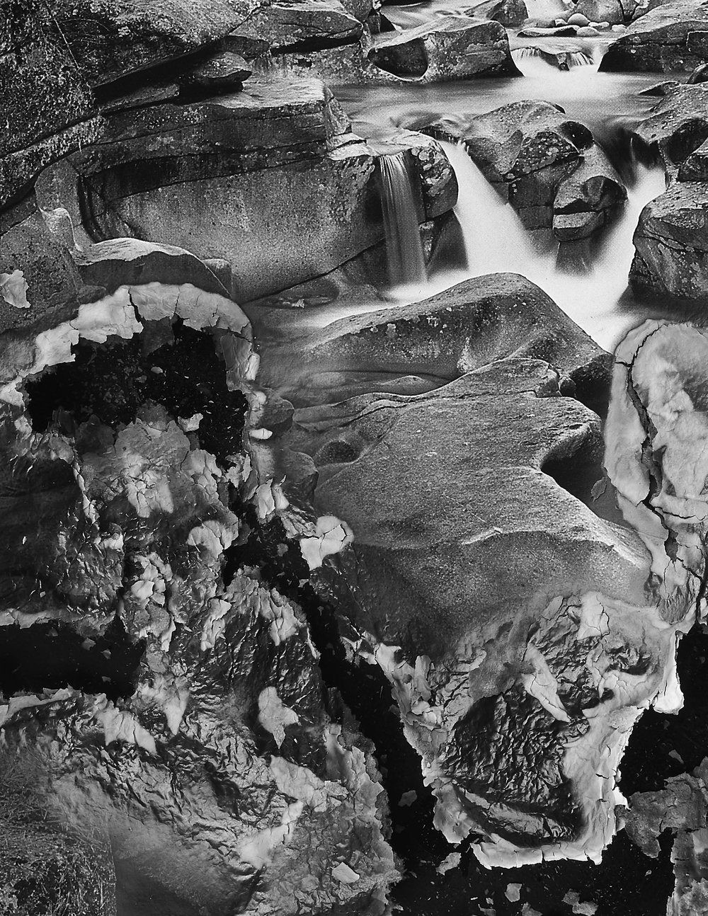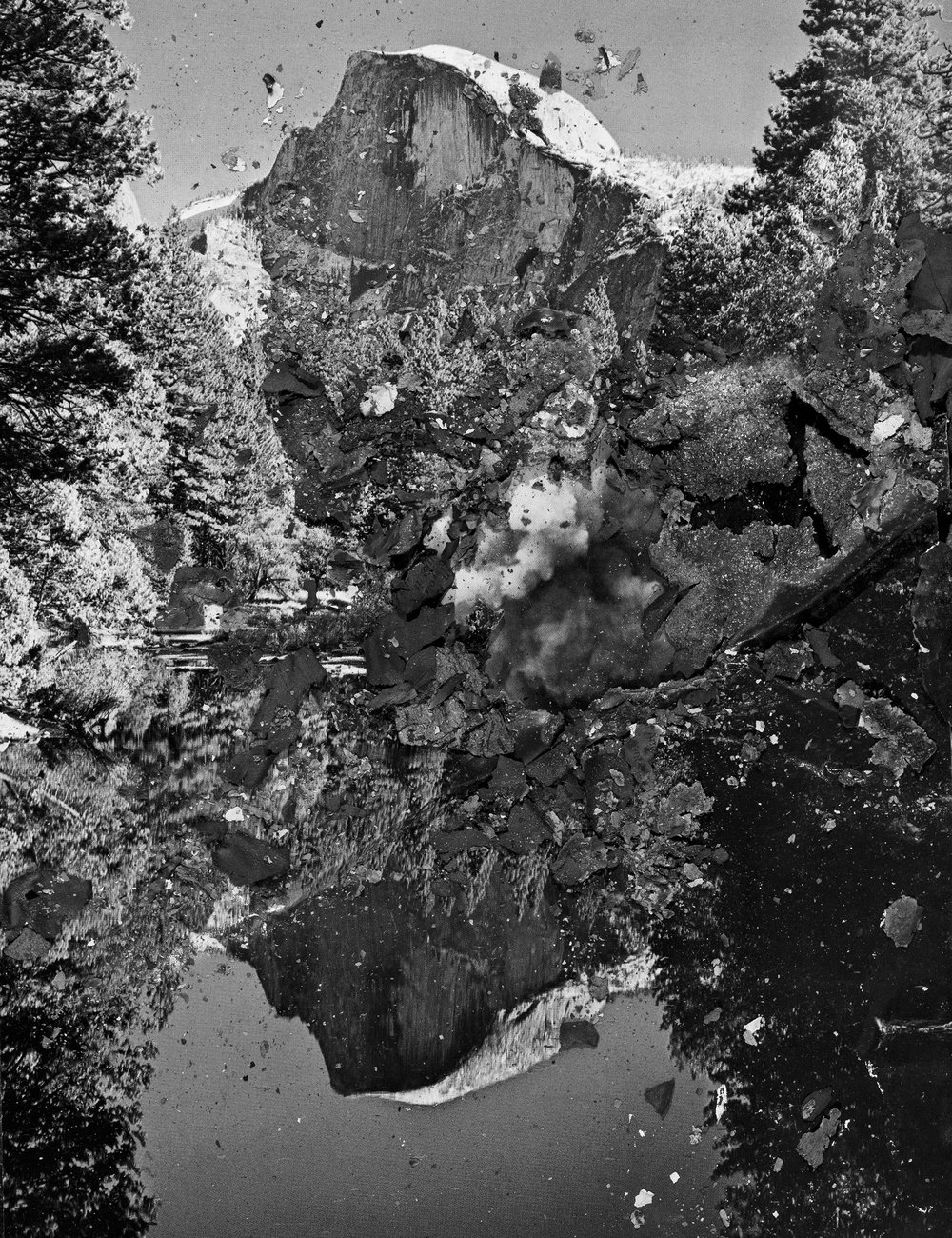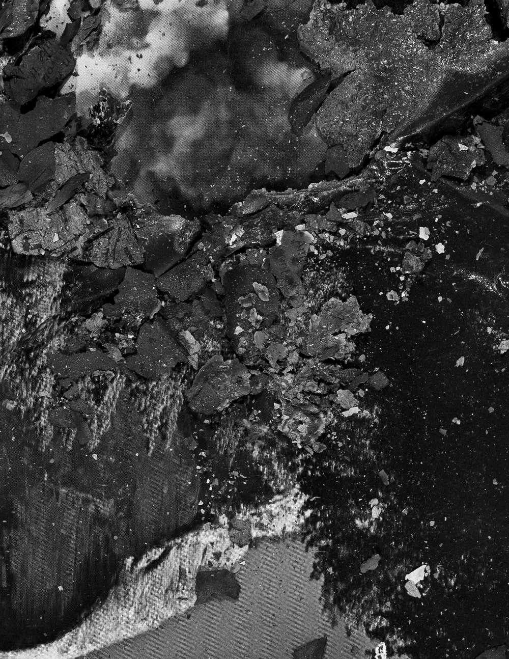 “Khalaf’s sublime, black and white, natural world landscapes offer up beauty and uncertainty. Using various processes of degradation (burning, smashing, consuming) the artist re-imagines the natural world, taking the viewer beyond the nihilism of destruction, into the generative possibilities that are offered by voids and absences. Troubling, and all too relevant, the photographs include the destruction of nature in their process; in many of the works, the source of that violence is fire. Each photograph contains burned areas where Khalaf sets afire a section of the composition. Leaving part of the photo to burn away, she then extinguishes it and photographs whatever is left over, creating new images. While suggesting destruction, Khalaf’s unmaking doesn’t spiral entirely into nothingness, but leaves an absence as a relic of her action. Ultimately she demonstrates that it is still possible to discover unexpected beauty in destruction and, in so doing, opens up the viewer’s sense of the sublime.