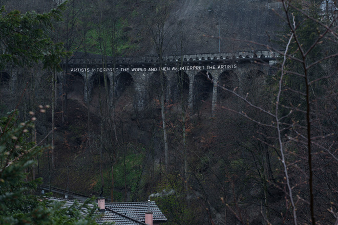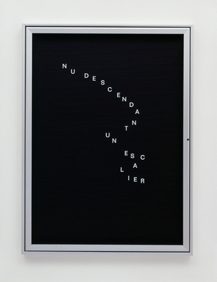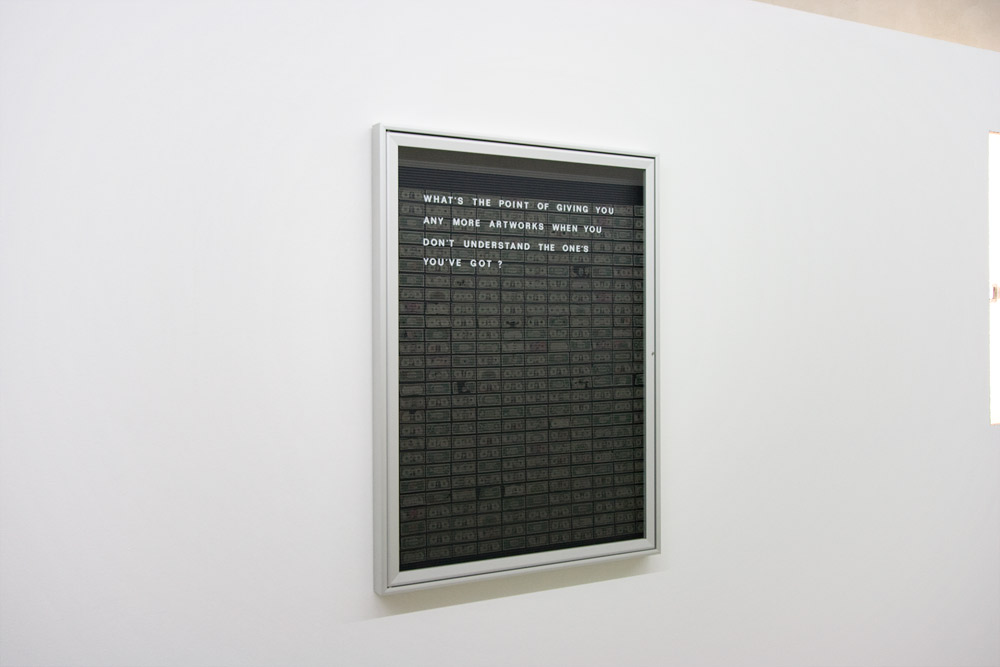 “‘Piss off I’m a fountain!’ an abusive notice board proclaims in white plastic letters on a black ground. Are these the words of an offended ornament that we have mistaken for a urinal? Or are they the angry reaction of a readymade that feels it has not been identified promptly enough as a Duchampian paradigm? In fact, there is no object in sight to which the text might refer: in this piece, entitled Word (2003), Bethan Huws plays with the mere possibility of an object, a situation, a perception. Formerly used for official announcements in offices, these sober blackboards with their aluminium frames and moveable white letters have, for the past eight years, served Huws for her polysemantic language pictures. One might say she writes scripts for potential encounters with possible art works.