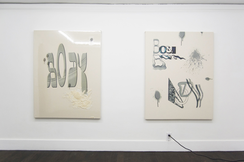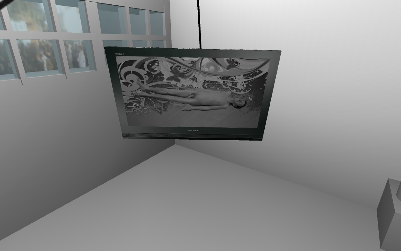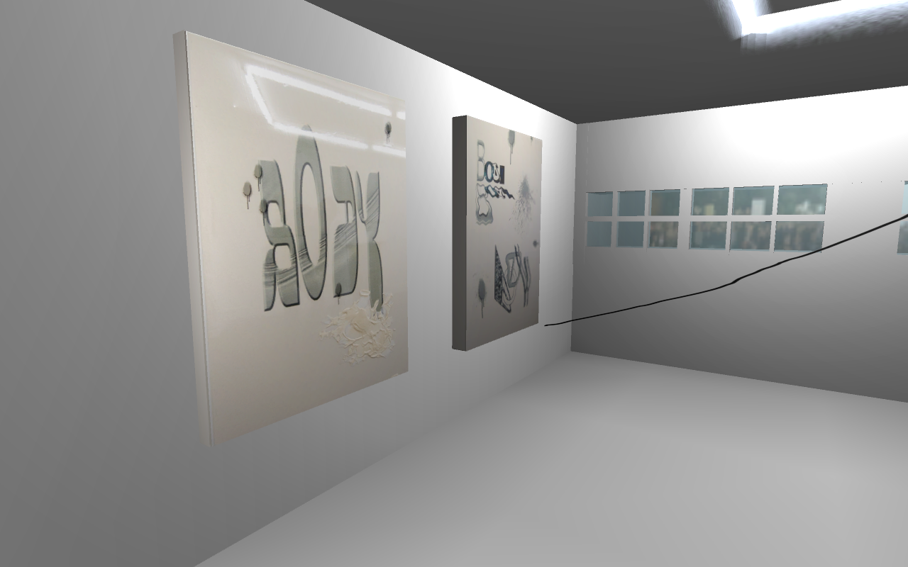 After downloading source material from mediafire, listening to a motivational mp3, seeing installation pictures, and playing in an interactive 3D recreation of their current exhibition at Important Projects in Oakland, it seems no surprise to me that Body by Body were “[attempting] to ‘smear’ the exhibition out over time.” Through the multiple layers of engagement and several avenues for participation, Body By Body (otherwise known as Melissa Sachs and Cameron Soren) invest a great deal in developing lasting dialogs that can be sustained beyond the initial “hype” that goes along with the physical manifestation of work that primarily exists through networked exchange. As a result the pieces on display from October 29th to December 3rd take on the form of traditional gallery objects that serve as metaphorical placement holders. The allegorical “paintings” and “video” – speaking very loosely – create a bridge between the expectations of differing art communities that exists online, offline, and somewhere in between. The tension built from attempting to navigate these zones of production and distribution become focal points of criticism of attention. Each venue, be it digital or analog, acts as a comment on the other. The bouncing back and forth between these arenas creates a subtle reflection on the properties and materials that each field provides.