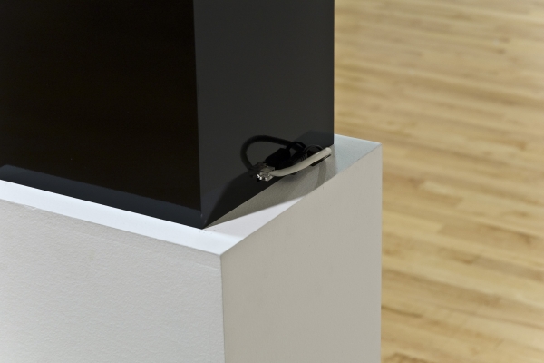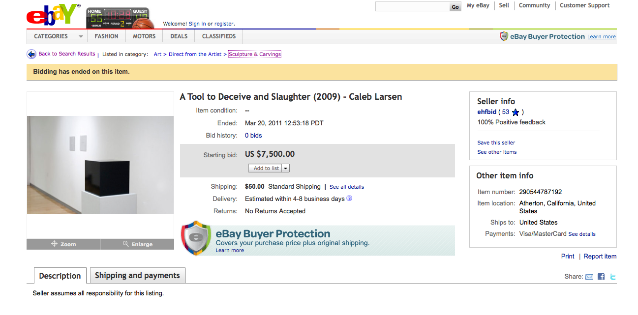 “Combining Robert Morris’ Box With the Sound of Its Own Making with Baudrillard’s writing on the art auction this sculpture exists in eternal transactional flux. It is a physical sculpture that is perptually attempting to auction itself on eBay. Every ten minutes the black box pings a server on the internet via the ethernet connection to check if it is for sale on the eBay. If its auction has ended or it has sold, it automatically creates a new auction of itself. If a person buys it on eBay, the current owner is required to send it to the new owner. The new owner must then plug it into ethernet, and the cycle repeats itself.” – Caleb Larsen
