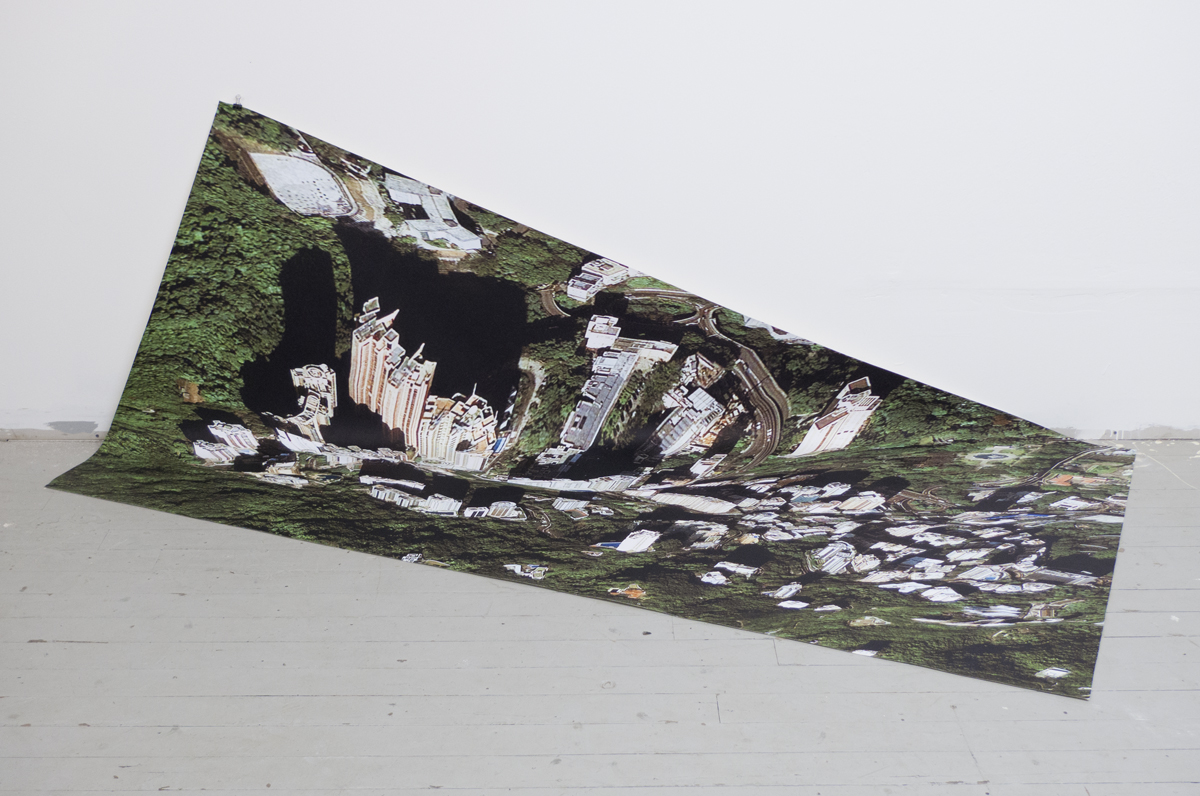 I collect Google Earth images. I discovered them by accident, these particularly strange snapshots, where the illusion of a seamless and accurate representation of the Earth’s surface seems to break down. I was Google Earth-ing, when I noticed that a striking number of buildings looked like they were upside down. I could tell there were two competing visual inputs here —the 3D model that formed the surface of the earth, and the mapping of the aerial photography; they didn’t match up. Depth cues in the aerial photographs, like shadows and lighting, were not aligning with the depth cues of the 3D model.