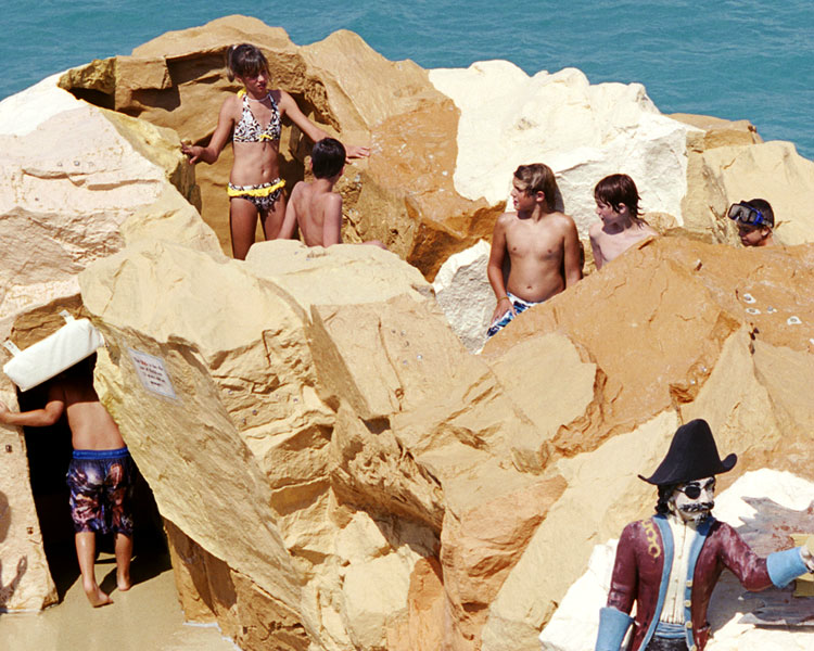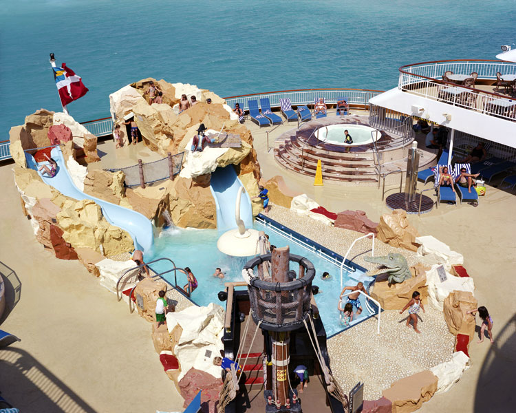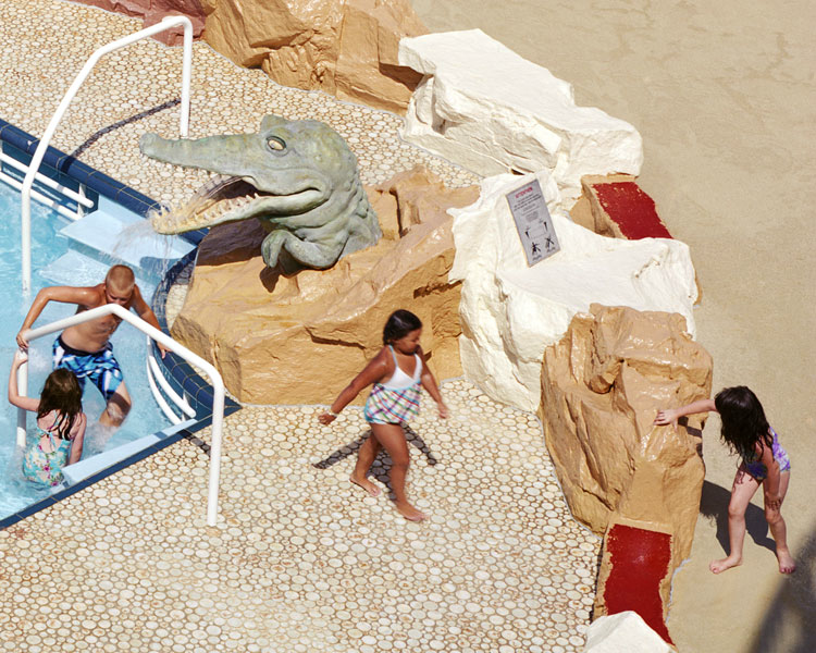 “My most current work depicts a spectacular American culture saturated with large-scale color imagery, consumerism, and forward momentum. The attractions featured in this series are both novel and commonplace, including parades, reenactments, fairs, and trade shows in ordinary communities around our country every day. Each event is transitory, challenging me to capture a single image before that scene is forever altered. Photographing multiple frames at each location allows me to draw out fragmented cinematic feeling narratives between the subjects and their environments by seamlessly compositing them together.
