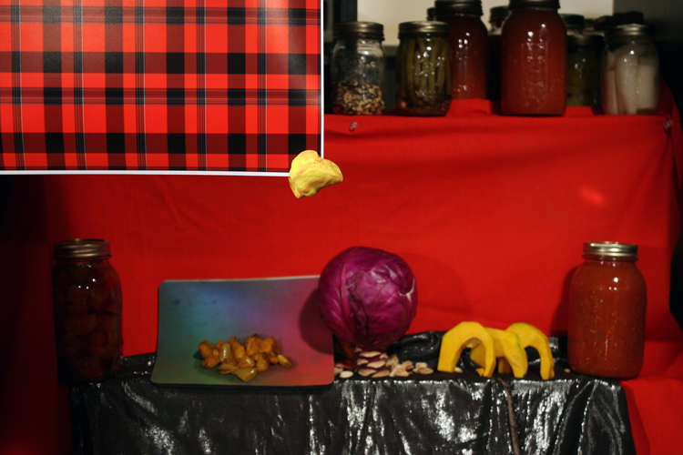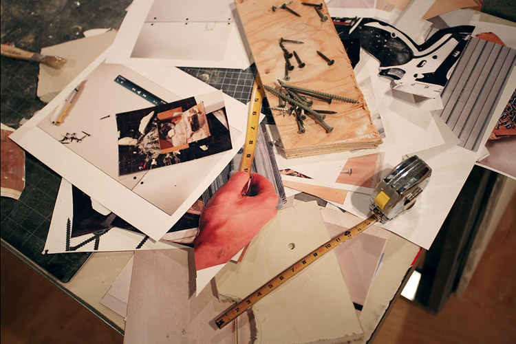 One catches the I-beam in the midst of putting on its make-up, the gallery’s column perfumed with the scent of its past, and the two-by-four caught in an awkward contraposto pose. The viewer becomes implicit in the stage as laboratory, and the unsettling consequences of the theater suspended in the wrong, unfinished moment.” – Laurel Gitlen