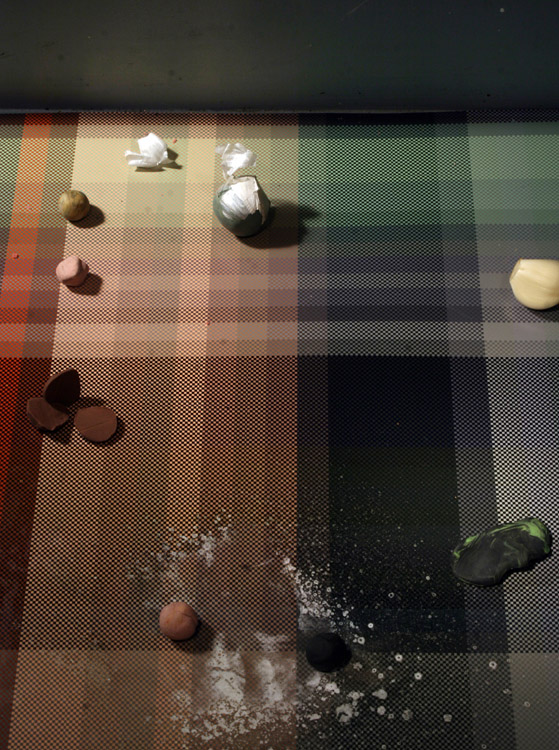 The gridded, cast-earth screens are curious, fertile geometric blinds that not only conceal and bury, but also suggest growth and potential. Perfectly formed into uniform blocks for construction, Hewitt’s dirt tiles function as temporal and material units of measure while still redolent of mortality. Soil, an aggregate field, is both origin and end, constantly in decay yet giving way to life. These tiles, however, function only as façade, revealing their unfinished plywood backs. Similarly, the dramatic space of the theater and our collective suspension of disbelief locate perception, simulation and projection at the center of the work, simultaneously rejecting the idea of origin or the possibility of any space as real.