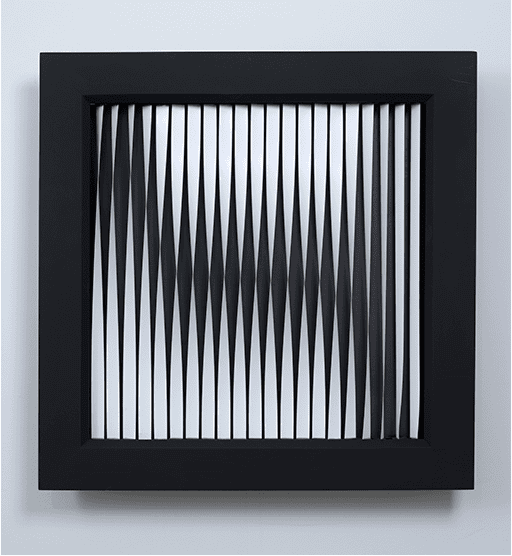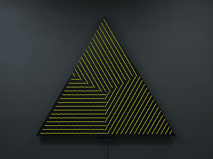 “Since the late 1990s, Rozin’s constructions in software and sculpture have investigated the psychological and optical cues inherent to image building, such as pattern and the materiality of the picture plane. In a departure from the traditional rectilinear grid, which was the foundation of his 2010 exhibit X by Y, Rozin’s new series of work proposes another geometric basis of image creation. Focusing on rotational systems of orientation, Angles celebrates the polar, or angular, notations of pictographic information. Using the triangle and sculptural elements that twist their shape, Rozin’s conversation of the grid highlights a new dimensionality of formal representation.