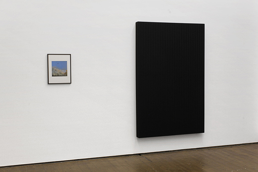 In the exhibition are four large black monochromes. These are acoustic panels built using instructions taken from online hi-fi and home studio recording websites. Named after the forums whose members conceived the designs, the panels offer a variety of techniques for absorbing the echoes from a room, for deadening sound. Using differing materials pulled over variously sized and shaped stretchers these forms assert a monumentality of absence.
