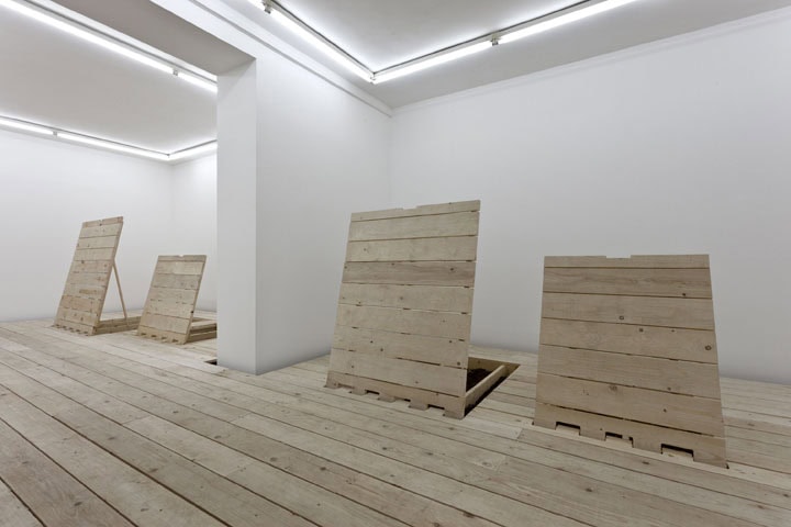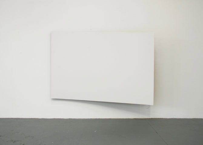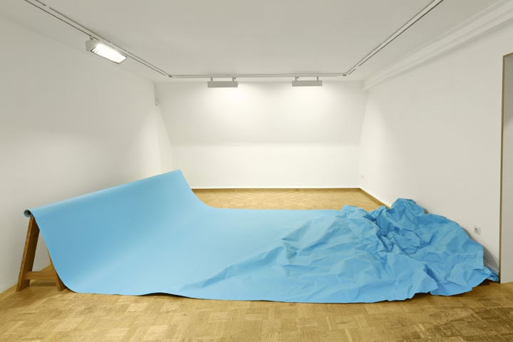 “…Addressing the painterly representation of landscape, he has also begun another series in two dimensions: images of riverbeds, including those of the East River and the Seine, made by throwing a large piece of canvas, filled with pebbles and tied with a rope, into the waterways. After leaving the canvas submerged for about two hours, he pulls it back to shore, creating a visual record in water stains, algae and mud. Expanses of untreated canvas, the final works, East River Painting (2009), La Seine Painting (2010), and Douro Painting (2010), feature green or black smudges (depending on the health of the river), accumulations of silt and the occasional leaf of an underwater plant—poetic compositions shaped by Balula’s plunge into the natural environment…” – Lillian Davies for Art in America.