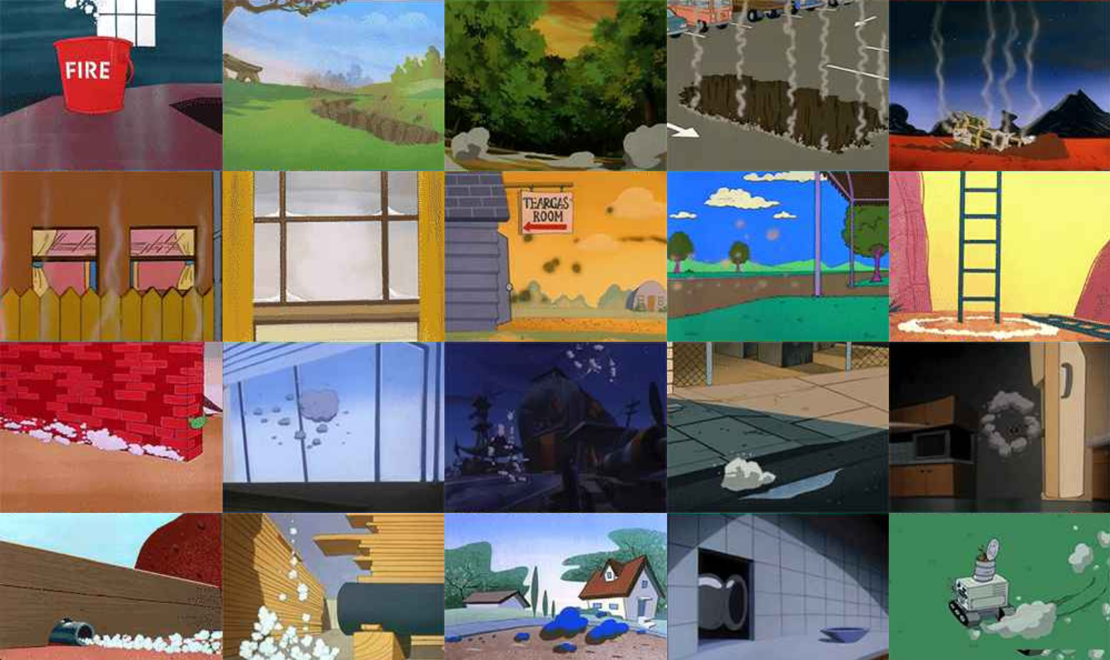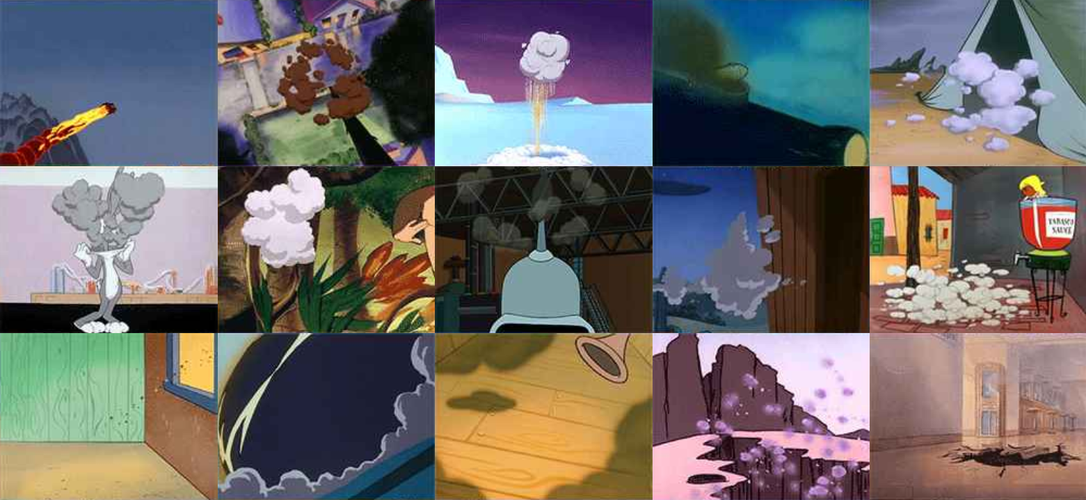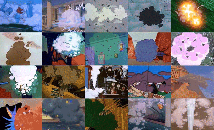 Kelberman’s original website features an ever-growing grid of gifs (at the time of launch, there are seven hundred total)—each one an image of smoke or fire excerpted from an iconic cartoon (the list now includes The Smurfs, The Simpsons, Tom & Jerry, Darkwing Duck, Rocky & Bullwinkle, and many more). The project is hatched out of the artist’s obsessive online surfing—for this project, she located and sampled hundreds of cartoons out of the thousands that she chose—as well as out of a desire to order and rearrange the seemingly endless amount of information available to her. The gif images are linked not strictly by subject matter but also through more free-form visual associations, like form, color, and shape. The resulting work is a psychic tour of disasters as they are pictured to children (and/or other cartoon enthusiasts). Here, the successive images of smoke and fire pose no threat.