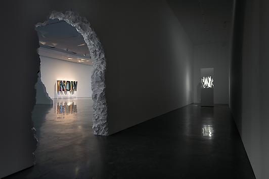 Taking its name from the traditional concept of nature morte, Aitken’s Still Life presents an immersive environment where place and time dissolves, where the individual exists adrift in an electrically charged space. Wending their way through the gallery, viewers are confronted with a series of signs and symbols that at first glance appear familiar but upon closer inspection reveal their foreign nature. A series of internally illuminated light box sculptures hover on the gallery walls. Combining text and image into physical form, they each represent the crystallization of an idea captured from the frenetic modern landscape.