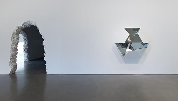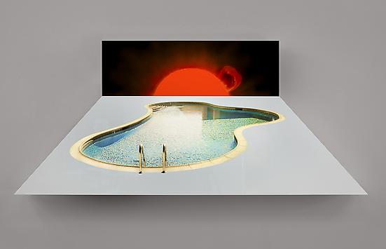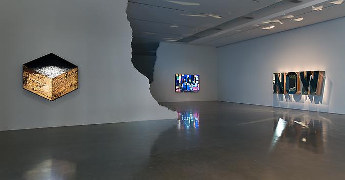 Among the other works featured in the exhibition is a cast public pay phone bathed in a luminous glow. Appearing as a relic of a bygone era and removed from its everyday function the work becomes a vessel emitting interactive light that brightens or dims depending on the viewer’s proximity to its surface. A sonic fountain combines water and sound creating a visceral optical and auditory experience. A hexagonal sculpture features a collage photo of an aerial view of the LA freeway system infinitely reflected in a series of mirrors, creating a kaleidoscopic vision. Existing as a series of ruptures, the works in Aitken’s subconscious twilight terrain unfold in a parallel of time and space, perceptually suspended in time.” – Regen Projects