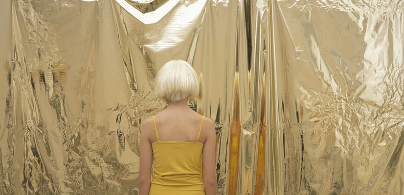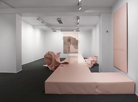 “The challenge that lies in spatiality and site-specific possibilities is an essential element that comes strikingly to view in the installation Cover from 2010. The space is dominated by a shiny pink podium covered with paper which is torn at one end. It is formed in the shape of an L and covered in paper of the same color. At each end of the podium photographs are hanging, partly or completely packaged in the same pink paper that is wrapped around the podium.