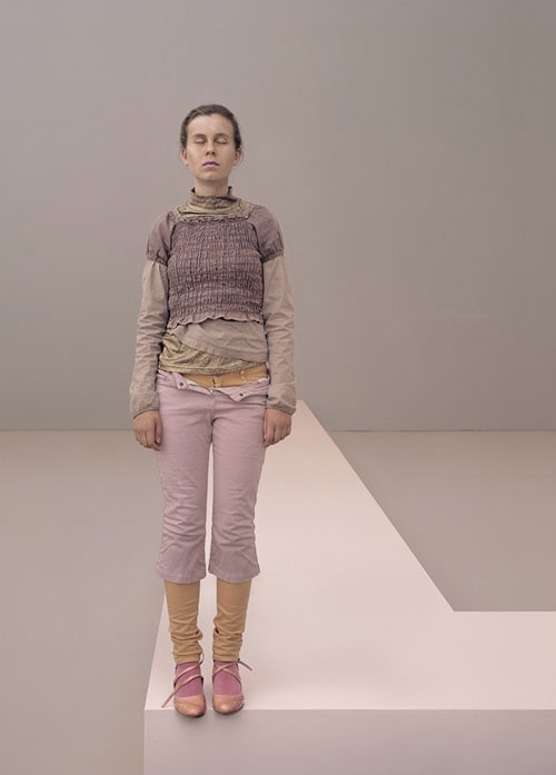 One photograph depicts the same podium with a model teetering on its edge, indicating that this podium is a catwalk. The model stands with eyes closed, clothed in disheveled layers. This creates a measure of disquiet in the otherwise serene, pastel pink and flesh-toned surroundings. We notice that the subtle tearing in both the models clothes and the paper on the catwalk creates a tense conflict between what is covered and what is torn. The combination of photographs and sculptural objects which both relate to each other on several levels, affords the viewer possibilities for relating to Hagen’s dualities and reflections of well-known themes.