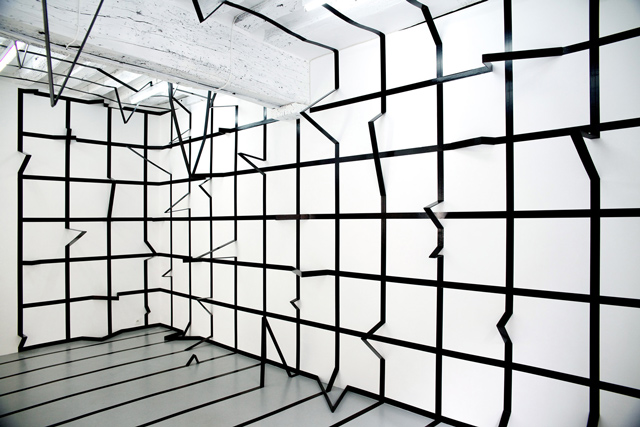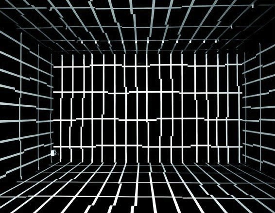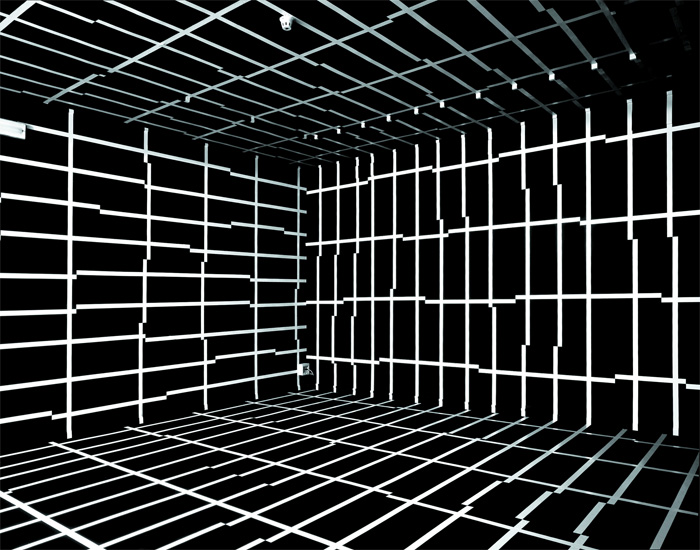 “In the late nineties Esther Stocker debuted with geometric abstract paintings, in which signs and orthogonal grids are superimposed on a limited range of colours: white, grey, black. In these paintings, the irregular grids recall the concept of ‘mimesis’ – not in the Platonic sense of the imitation of nature, but rather in the sense of ‘camouflage’ – and through that have the ability to test the perceptual faculties of the viewer. If these concepts evoke, in part, the experiences of Op Art, Stocker’s work stands apart from them because “her” camouflage is not hidden but revealed and showed through many irregular grids. They expand from the canvas into space and invade floors, ceilings, walls of galleries and museums, becoming sensory installations: the viewer interacts with them and his perception and feelings of alienation and disorientation became the leitmotif of Stocker’s pursuit and also protagonists in her two works of this exhibition. Indeed for the first installation, Stocker intervenes in the white space of the “tunnel” with black bars of various sizes on the floor, ceiling and walls: the viewer is surrounded by this grammar of components projecting into space and he is guided inside the room to the back wall, towards unknown and uncertain something. Via these few elements, the entire architectural appearance of the space is transformed, expanding beyond the physical limit of the walls. What interests the artist are not the black bars on the walls but the empty space between them, the disintegration of the environment: this fragmentation of the space produces spatial ambiguity and perceptual uncertainty that generates loneliness, despair, excitement.