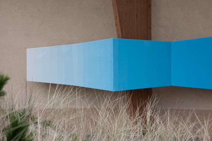 “Esther Tielemans has expanded the very concept of a landscape, culminating in installations of monumental dimensions such as the one she created at Eindhoven’s Van Abbemuseum on the invitation of Lily van der Stokker. From 2003 until today remarks Wilma Süto about Tieleman’s work, “painting as a medium has gradually evolved into a screen of reflections. (…) We sway along in an amazing pendulum-like movement on both sides of the surface of the water and the horizon, nature and culture, figurative and abstract, fake and real”. [1] Esther Tielemans alludes to the imposing landscapes of North America (the deserts of Nevada and New Mexico), where the stainless “beauty” of nature can induce a disturbing state of solitude. The painting becomes a panorama, a skyline. Groups of glossy coloured panels appear to float in front of the wall. Some of the wood panels on which the paintings are done attain the dimensions of walls arranged in space on the human scale. The nexus with nature and the outer world is inverted in the conception of inner space. And there are some hints of an explanation for this. At the start of the present decade, a number of Tielemans’ paintings were materially incorporated into installations that also included diverse objects. They gradually became “object-paintings”, on the frontier of “design”, and the represented space no longer had anything more than a distant connection to the reality of a landscape. At present Esther Tielemans’ paintings, whatever their size, are wholly shorn of scale. They seem, in fact, to float in weightlessness. Here is a theatrical experience. The exact reflection of a mental space whose deployment is only just beginning.” – Bernard Zürcher