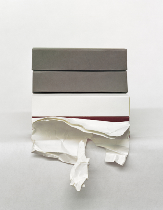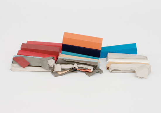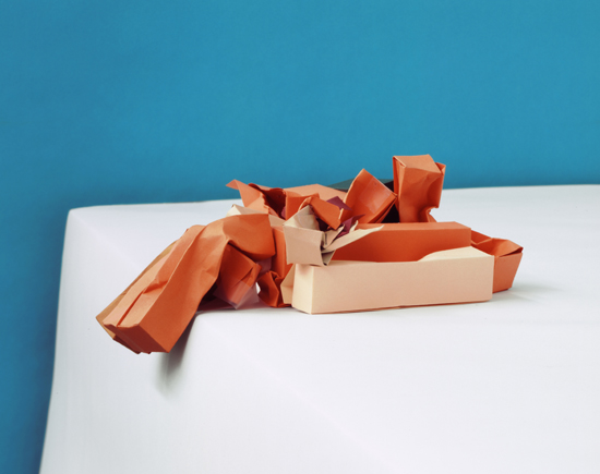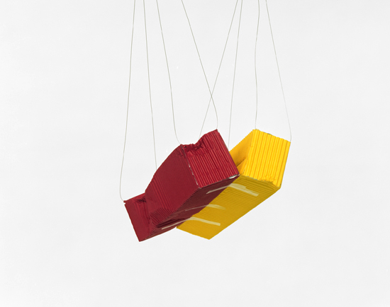 ” The series DestructConstruct is based on found photographs of shipping container accidents downloaded from the Internet. Each found image is used as a model for a sculpture that is constructed for the production of the photograph. Individual shipping containers are folded by hand out templates of colored cardstock, and placed according to the found image. The sculpture then exists as a photographic work, which directly relates to the original photograph, including the ship name, place, and date the accident happened. I abstract the scenes of the catastrophes, removing the original context and placing the damaged containers, rendered simply out of colored paper, onto a seamless white background. This process transforms the containers into pristine patterns of color and shape, thereby confusing scale and altering the perception of the shipping container as an object. The paper is now seen as fragile, crushed or torn due to an unknown circumstance.” – via Heather Rasmussen