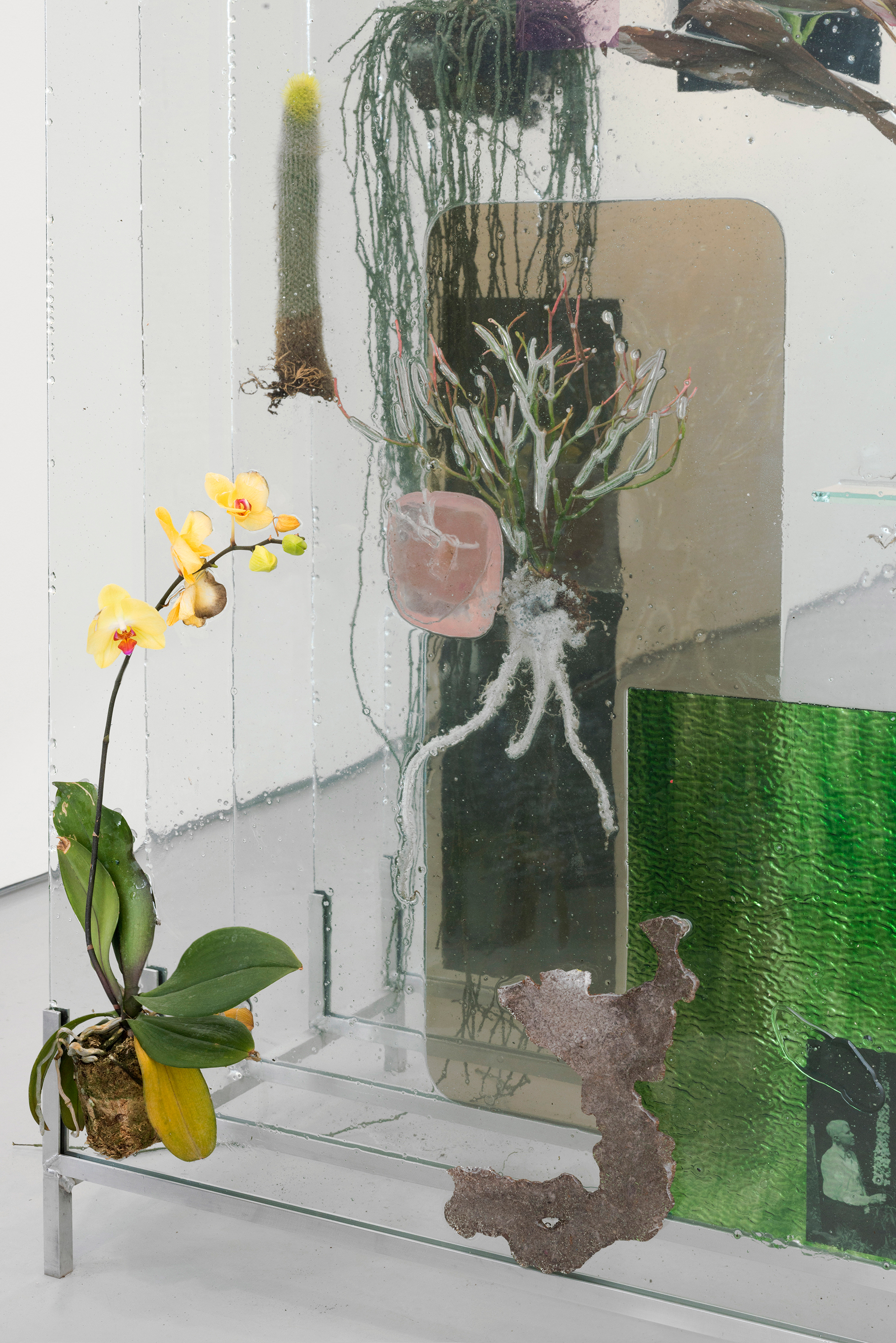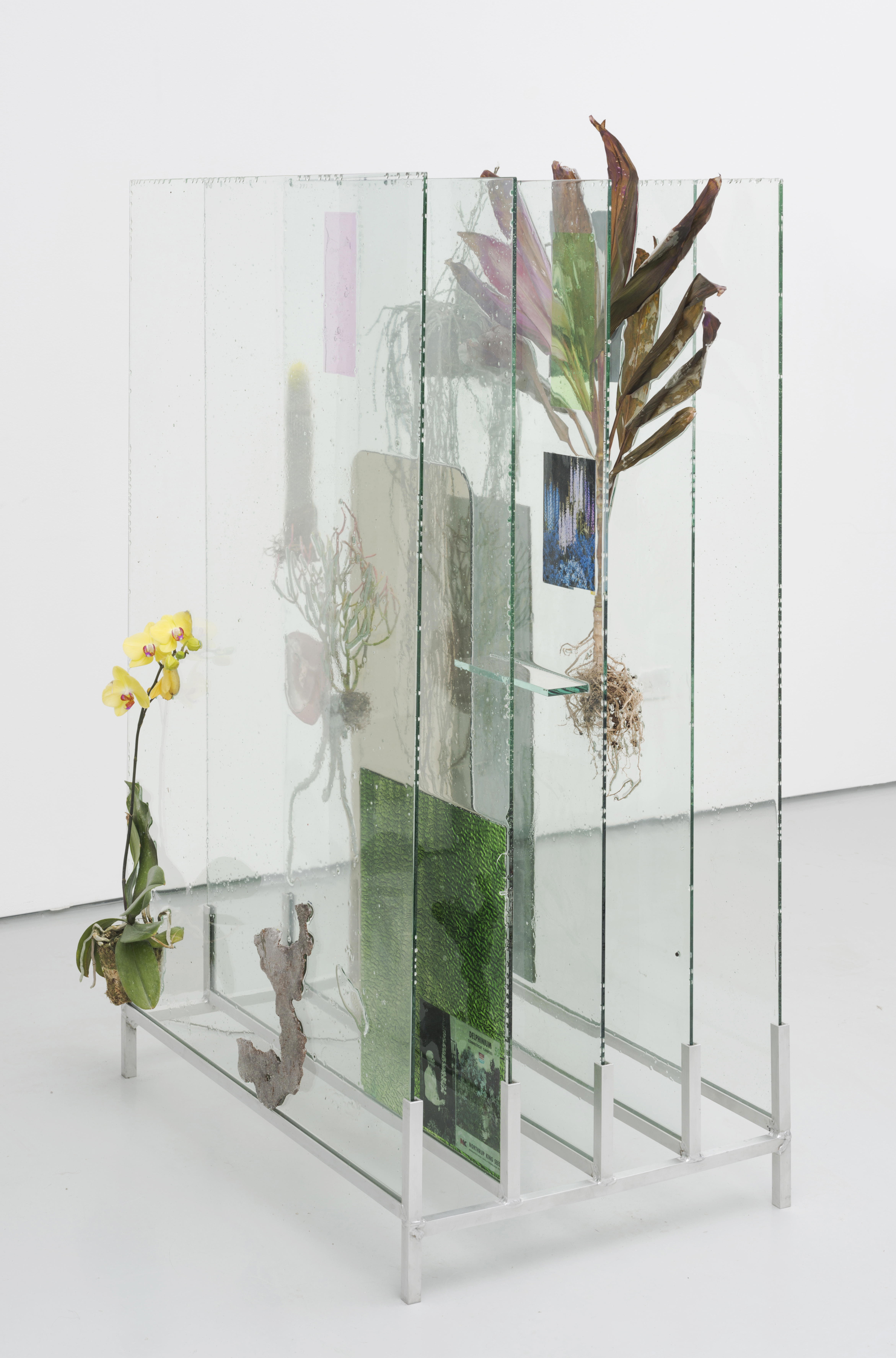 The relationship between image and object is cyclical and malleable. Material is deconstructed and folded into new works, objects become photographs and photographs become objects, each activating and demanding a new space. The studio is the activation site. It’s hybridity between plant study and art production is a constant negotiation. It has provided insight into my process, helping me realize that I have different ways of performing and producing. The photographic process is methodical and structured, allowing me to use the lens to distort, skew and disrupt space and time–to fix, to sterilize, to make permanent. The sculptural process is one of improvisation, of reaction, of movement, of change. Glass is broken, resin is recycled, dead plant is plucked, and impressions of the studio are lifted and layered into new works.” – Heidi Norton