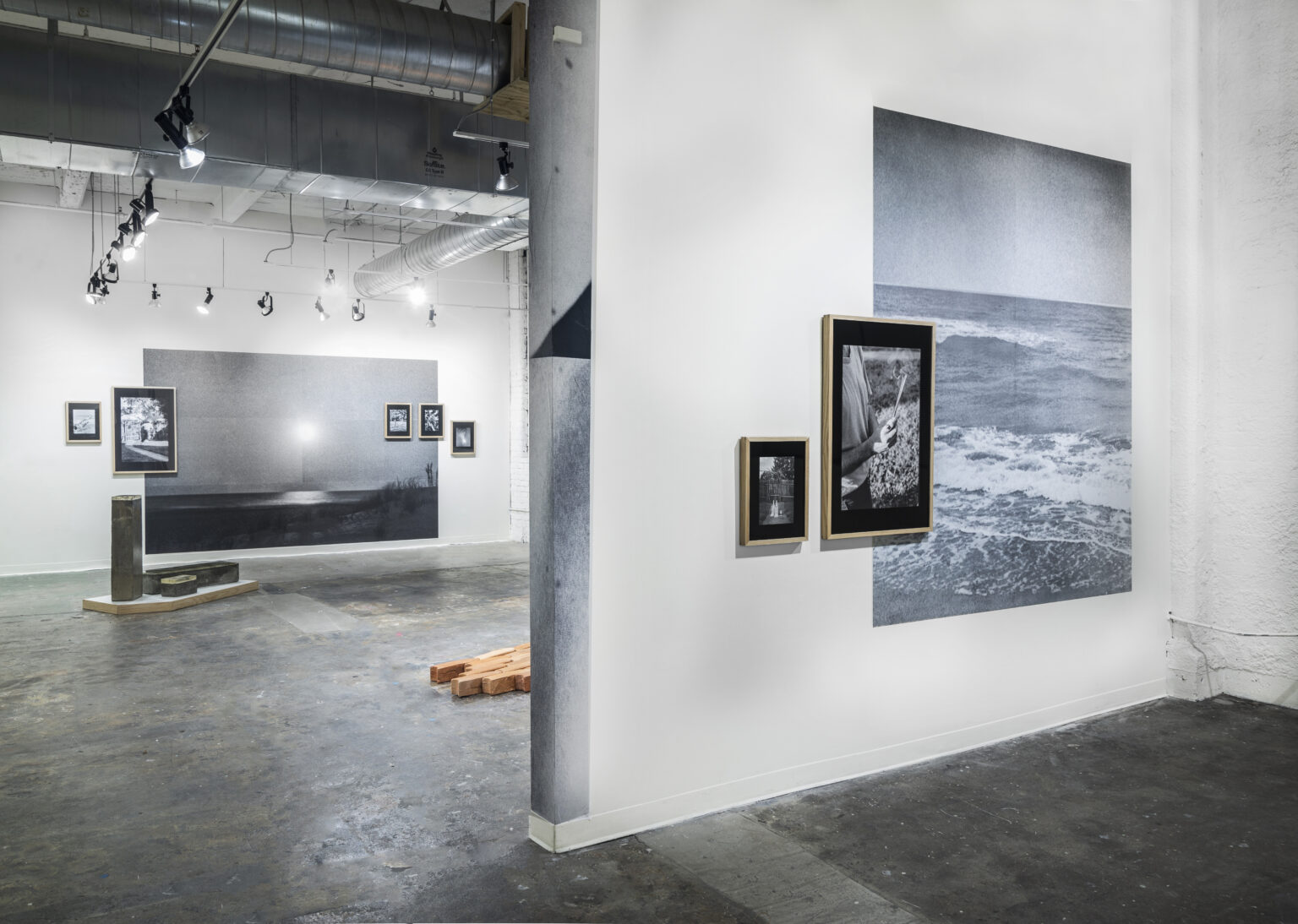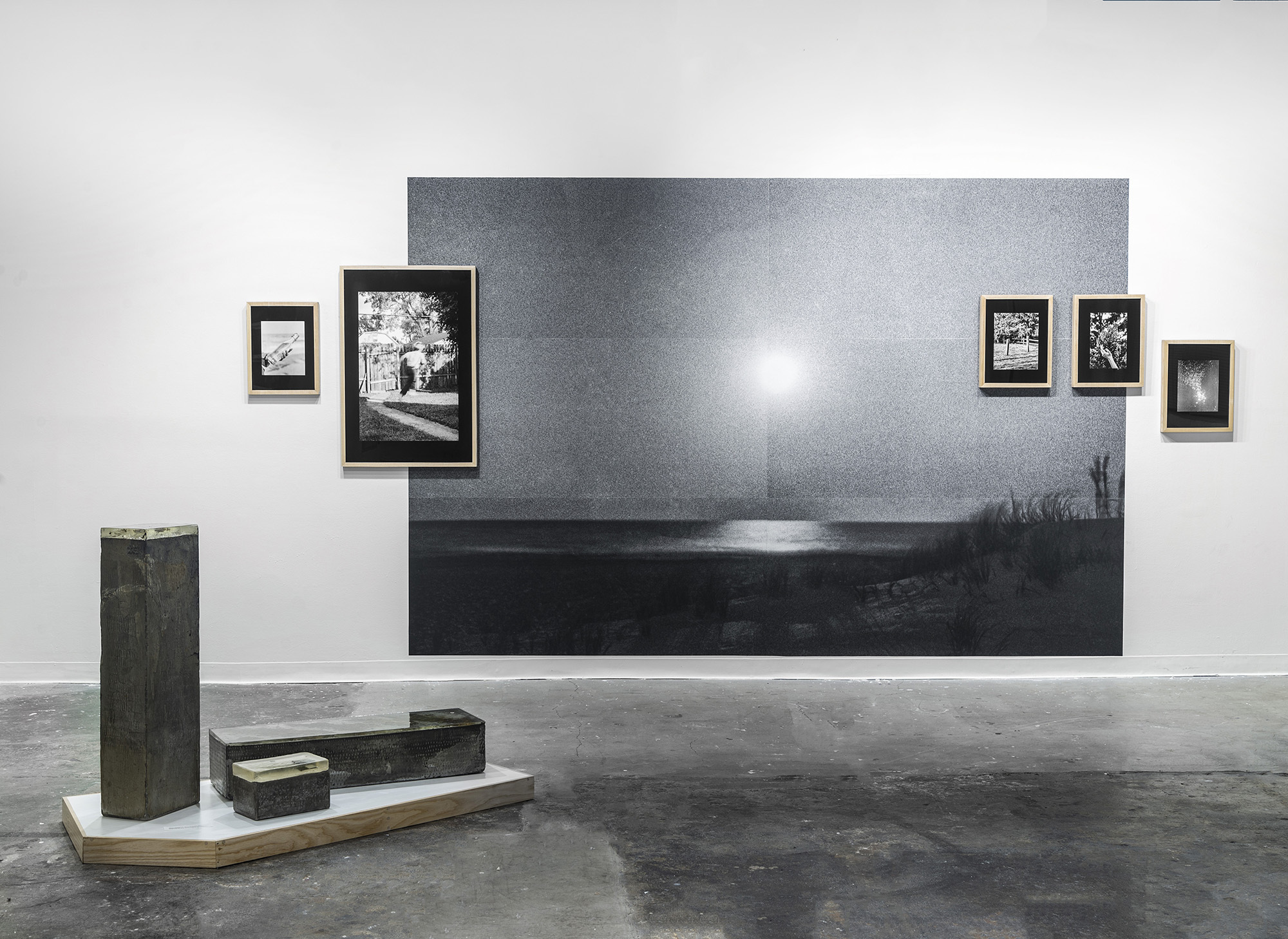 In Regards to Nostalgia presents affective artworks placed into an exhibition design that heightens the effectiveness of those qualities. The works on view and Kang’s curatorial plan create a quietly energetic environment, where visual rhythms and aesthetic conversations between pieces occupy space. The works are well balanced throughout the gallery, creating moments for repose and response, to step back and place oneself into the artworks. Three large-scale photographic installations in black and white set the overall tone of the exhibition, drawing viewers into affective mind, body, and picture spaces. The effect is emotionally immersive, but not physically overwhelming. Two sculptures by Theobald help to break up the gallery area, encouraging the viewer to weave through the floor plan as though wading through a bank of memories. This physical consideration draws an acute parallel between the works on view and the exhibition design, where the viewers’ bodies are connected to the corporeal and spatial concerns of the exhibiting artists. The implication here is that nostalgia resides as much in the body as it does in the mind.