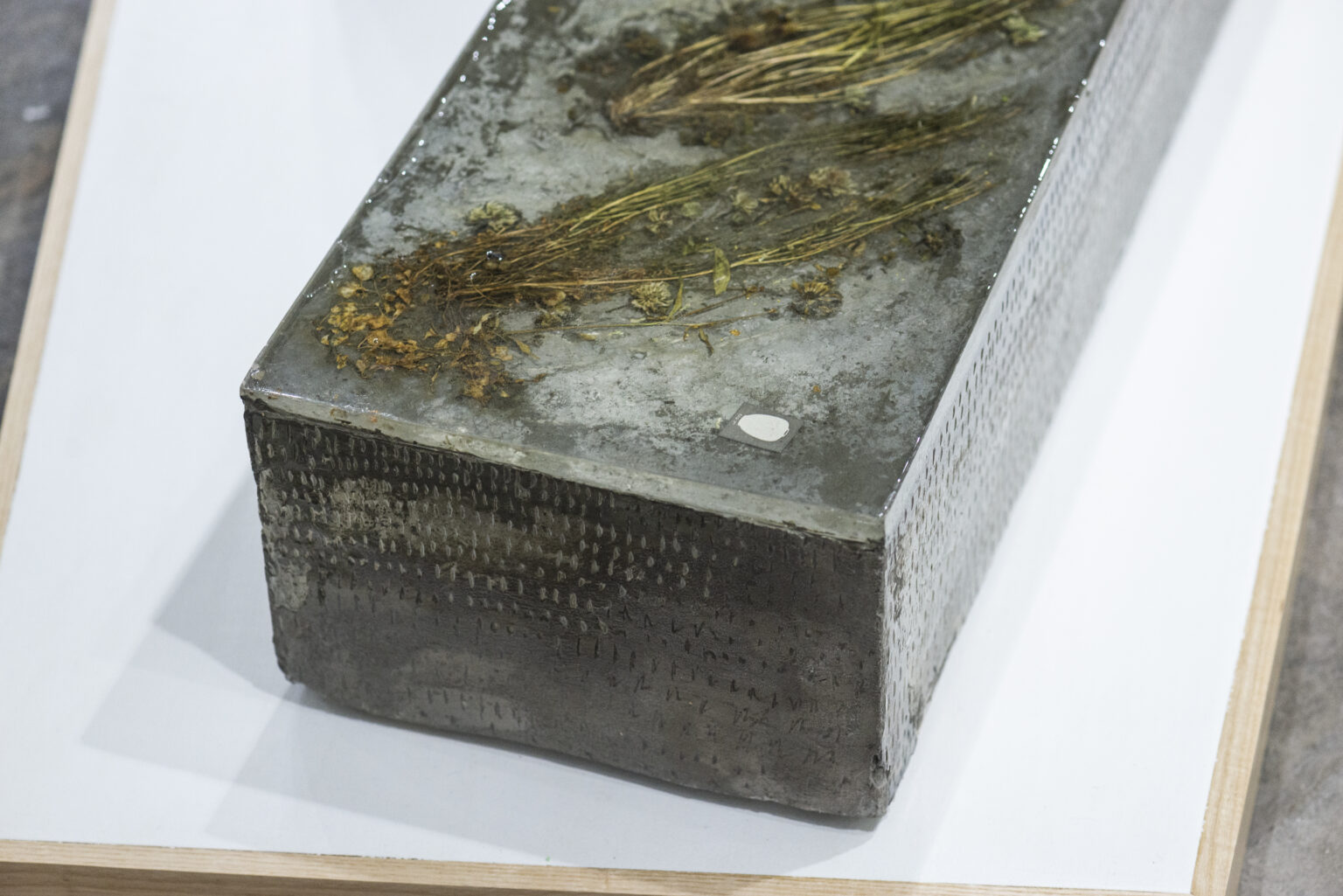 Throughout the exhibition, Kang taps into the well of emotions surrounding the poetry of the past, whether lived, imagined, documented, or perceived. In the statement for the show, the curator notes, “A marker of moments situated in the poetic, nostalgia is a mysterious and potent encounter that exists in the complexities of loss and longing for something that once was.” Notions of loss and longing are overtly evident in Theobald’s Without These Winds I Would Be Invisible. Constructed of Portland cement, resin, varnish, preserved flora, a love letter, and printed ephemera atop a custom plinth, the series of three sculptural works traffics in the material of memorials. A statement from the artist relays: “Each monument presents a desperate grasp to connect grief to mundane labor and daily affect, to pay homage to the objects our lost ones leave behind, to the stability memories do offer, to the (always) unbearable weight of loss nostalgia can bring up out of the blue.”Theobald offers object displays a viewer can breathe life and memories into. Her material choices echo the materials of history, longevity, and humanity. She presents the brick road of countless walkways, the concrete of everywhere, and through these access points, we are able to feel a connection to the artist’s history, as well as our own.