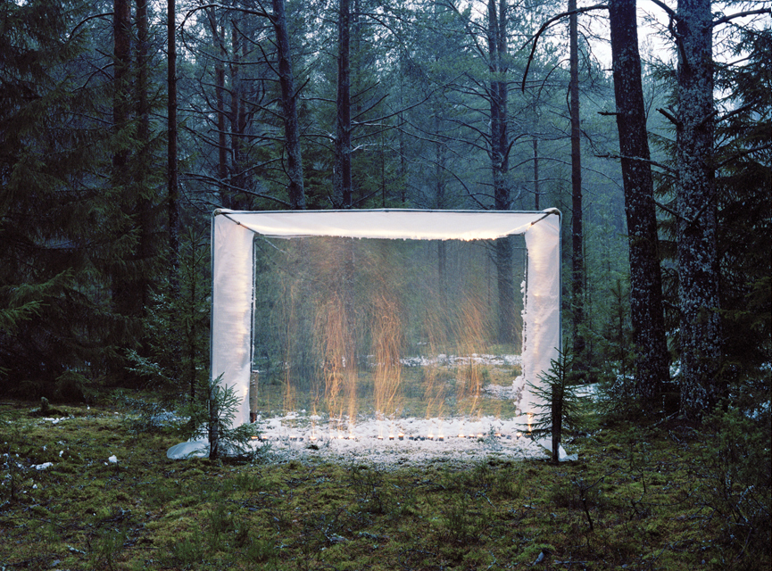 The white forms in these photographs are the sculptural manifestations of audio footage that was recorded along the border between Russia and Finland. Here the unique old-growth forests stand, The Green Belt of Fennoscandia. Recently these ancient trees are being logged for their valuable timber. There are only few remaining areas of ancient forest in Europe with the vast majority of the vanishing old-growth forests remaining are in the North of European Russia.