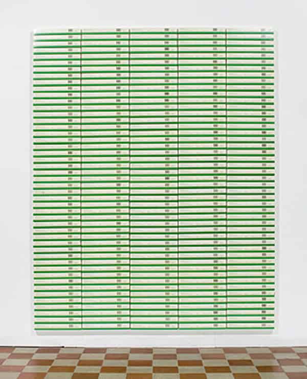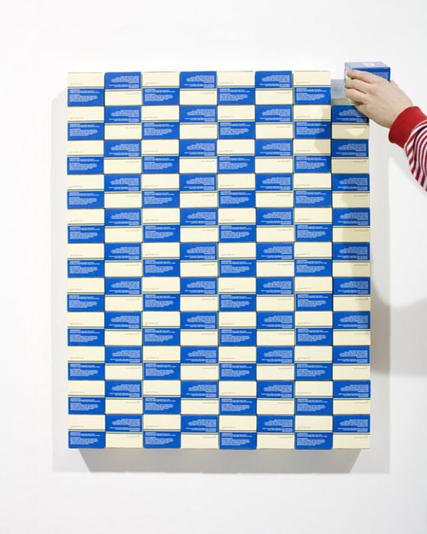 “Palermo1996 explores the allure of the supermarket and removes items directly from the shelves in order to create this contemporary geometric abstraction. As a result of the construction elements, metal and magnets, this work also functions very much as a performance piece, through the building of the work at the start of the exhibition to the potential multiple arrangements that could be achieved for the duration, and ending with the final removal of the boxes. This work combines the everyday, abstraction and a performative process in order to consider the relationship between the world, the body and geometry.” – Jacob Dahlgren