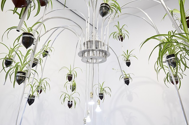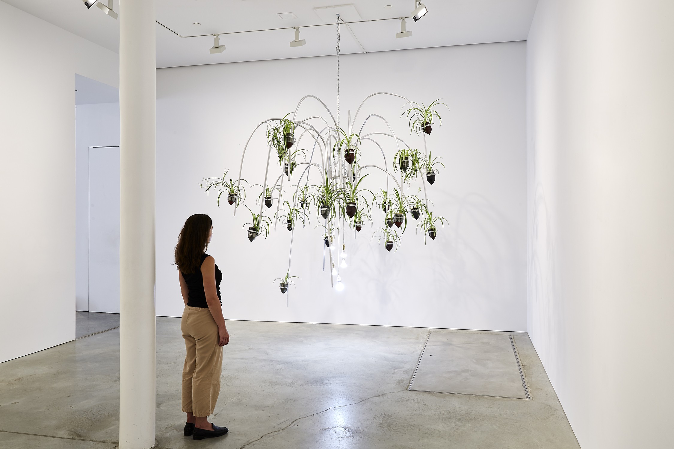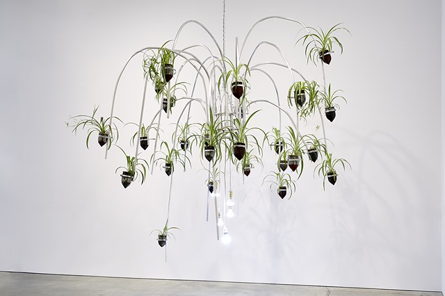 “Jeffrey Meris’s hanging sculptures, reminiscent of chandeliers, are made of aluminium piping, ceramic vessels, and spider plants. These materials, along with Meris’s shift from working with steel and iron to aluminum, a lighter, and, as Meris says, a more “intimate” metal—often found in domestic spaces for plumbing—can be seen as a metaphor for the shift in the artist’s practice, once centered around conversations of racialized trauma, to one focused on a steadfast devotion to healing, cleansing, and rituals of care.” – James Cohan Gallery