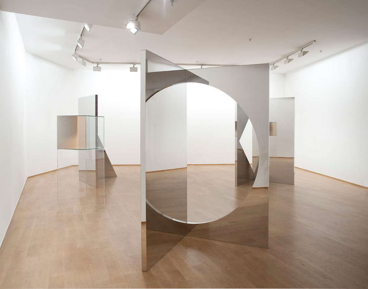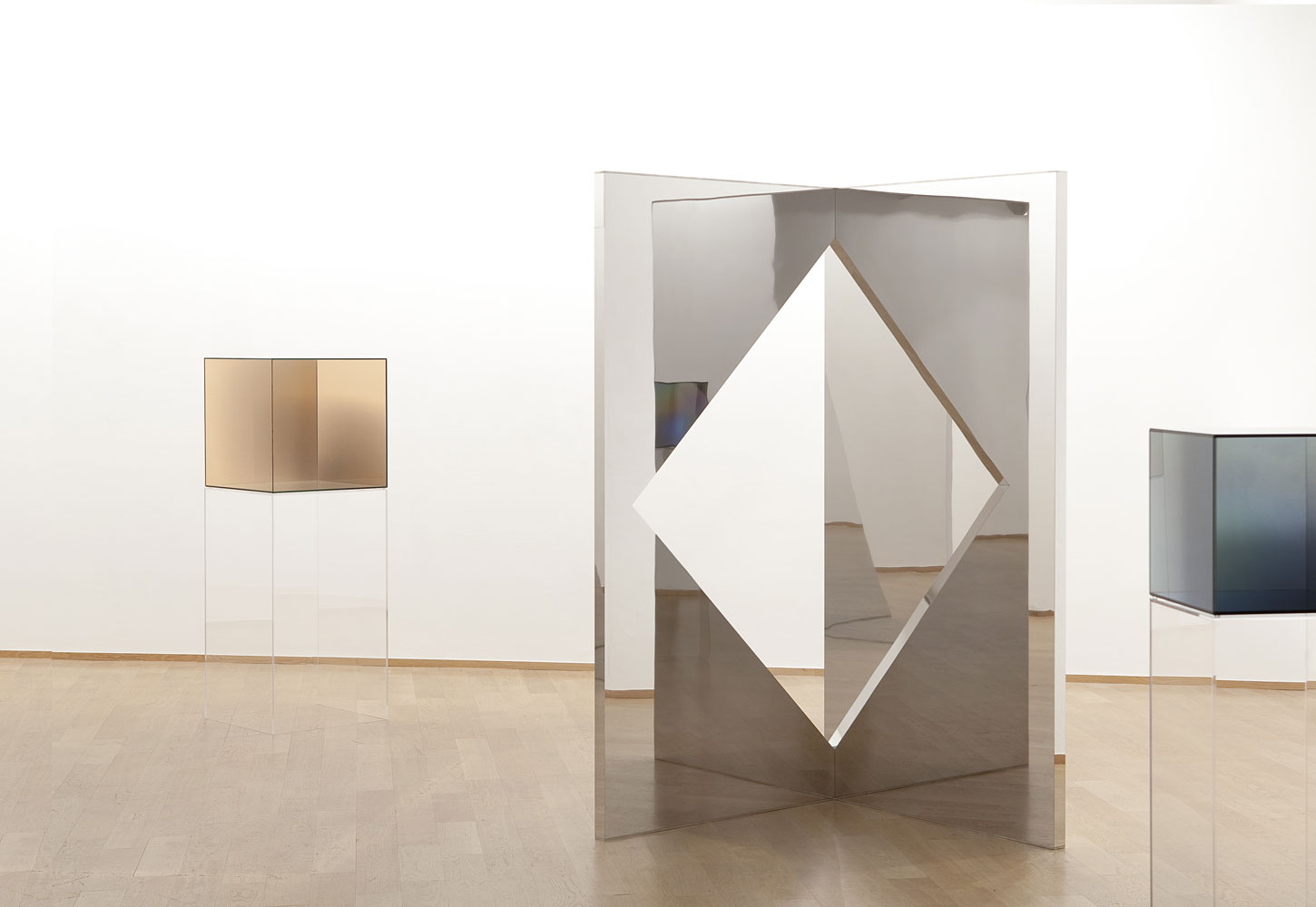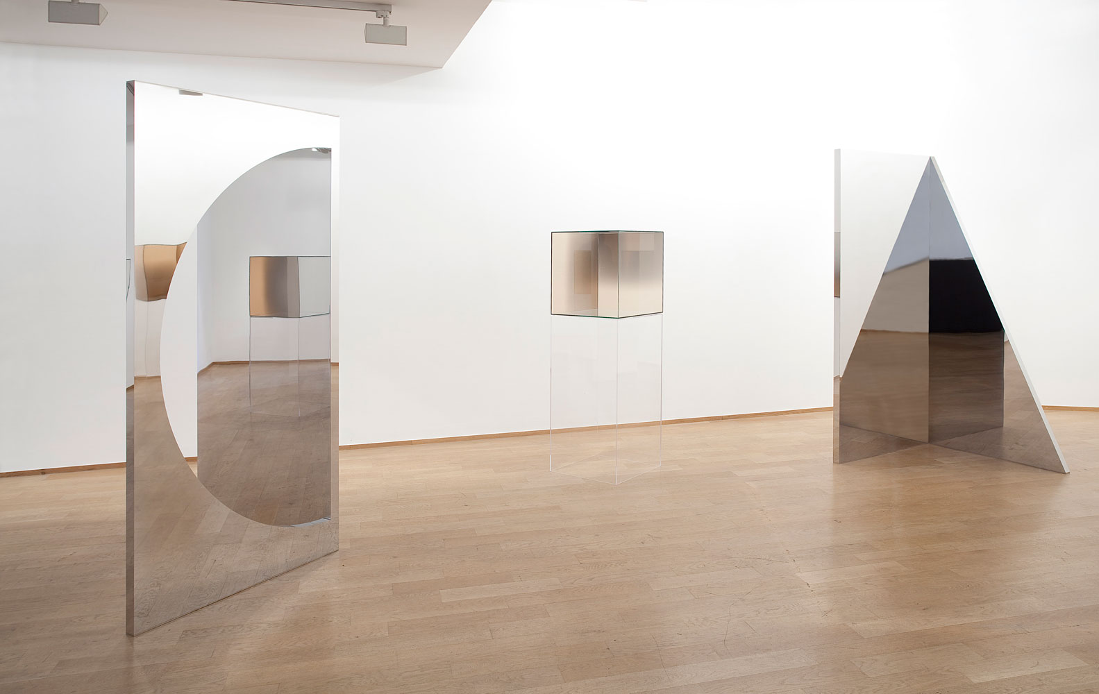 In addition, Geometric Mirrors I has a triangular opening on one side so that a full cube appears in the middle of the sculpture, Geometric Mirrors II has a semicircular opening on one side so that a full circle appears when seen from the front. Geometric Mirrors III in contrast consist of a mirrored rectangle and a rectangular triangle connected to each other so that an equal-sided triangle appears in the reflection.” – Jeppe Hein
