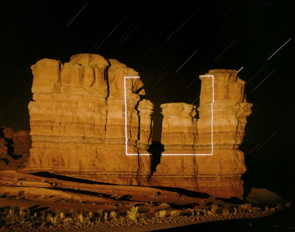“These images were produced by direct, large format, light projection. The projector, powered by a mobile generator, was moved from site to site. All of the pieces were photographed at night using long exposures. On moonless nights, the landscape was lit with searchlights. The landforms themselves are quite large, requiring the projector and camera to be, on average, 1/2 mile away from the subject landscape.” – Jim Sanborn