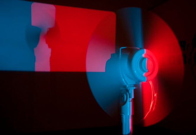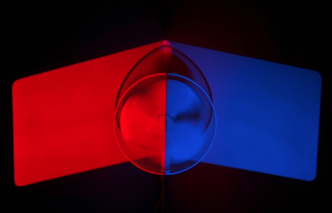 In my recent performance and installation work, I use modified 16mm projectors, sans film. Micro-controllers algorithmically vary the speed of the projectors’ motors. At slow speeds, the shutter’s passing before the bulb generates intense flickering patterns. But as motors accelerate, flickers become so fast that they disappear to the human eye. At this threshold, ephemeral forms with unexpected color and movement are generated by the viewer’s body.