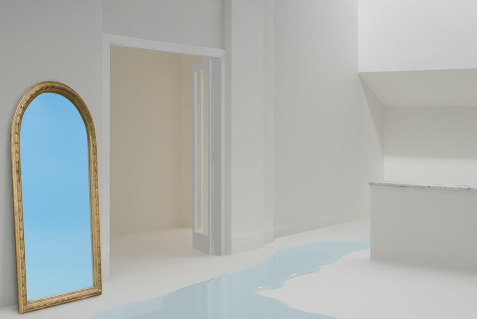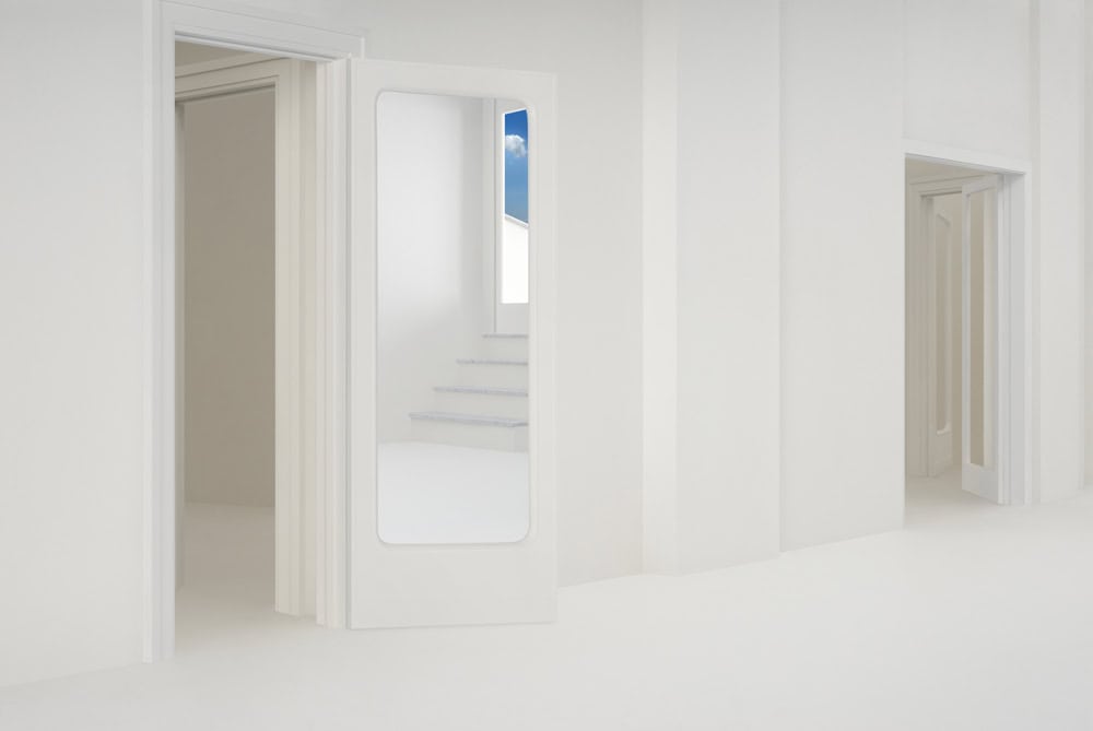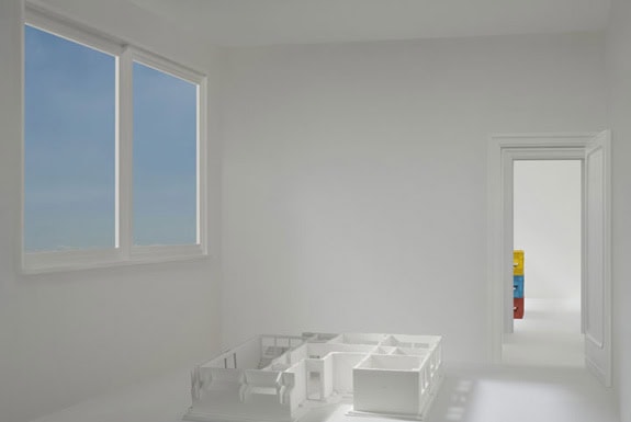 Massey is known for his metaphysical dramas, enacted in pristine, idealized architectural interiors that he treats like theatre sets. In this series, the interiors are modelled on the unfinished apartment in Rome where Godard set the pivotal scene of Le Mépris, which portrays a final breakdown of communication between the two lovers. Massey built a scale model of the apartment, shot each of its nine rooms, and configured his pictures with motifs from the film, including its strong primary colours and Mediterranean light. The apartment, in After Le Mépris, becomes a shrine to the scene from the film, its lost love and parting of ways, and also to larger farewells.