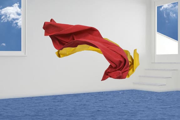 The picture entitled Red Curtain, with its ghostlike image of the lovers in the window, evokes this sense of things existing in the past or only in theory or memory. And in a sense, all the pictures in the series rely on such projection. The objects and images (the flowers, clothing, pillows and towels, mirrors and puddles, bright skies, amassed clouds, lights, reflections and shadows) have been placed in the rooms as projections into a story about what might happen next – regret, emptiness, solitude and wishful thinking but also hindsight, enlightenment and the return of optimism.” – Georgia Scherman Projects