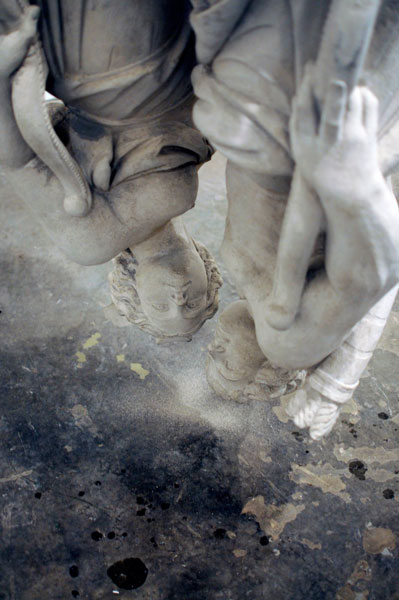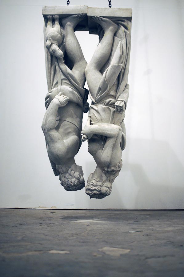 ” Two sculptures are hung from a mechanism that gently grinds them into each other. The sculptures will slide against one another for many years creating new unimagined form…